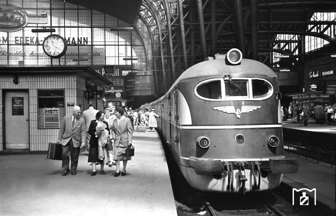 VT 12.14.02 (ein ungarischer Ganz-Triebwagen) der Deutschen Reichsbahn als Ft 65 (Hamburg-Altona ab 17.54 Uhr - Berlin Ostbf an 22.45 Uhr) in Hamburg Hbf. (05.1961) Foto: Carl Bellingrodt