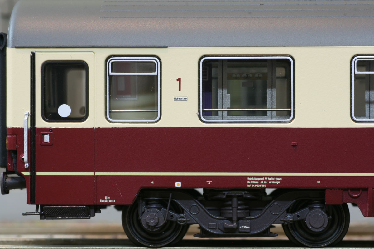 Leider wurde bei den Eurofima-Wagen 881808 und 881809 im Bereich der Drehgestelle übersehen, den Wagenboden auf die größeren und vorbildgerechten Drehgestelle anzupassen. Der Wagen mit der Artikelnummer 881808 wird im Werk allerdings noch VOR Auslieferung überarbeitet.