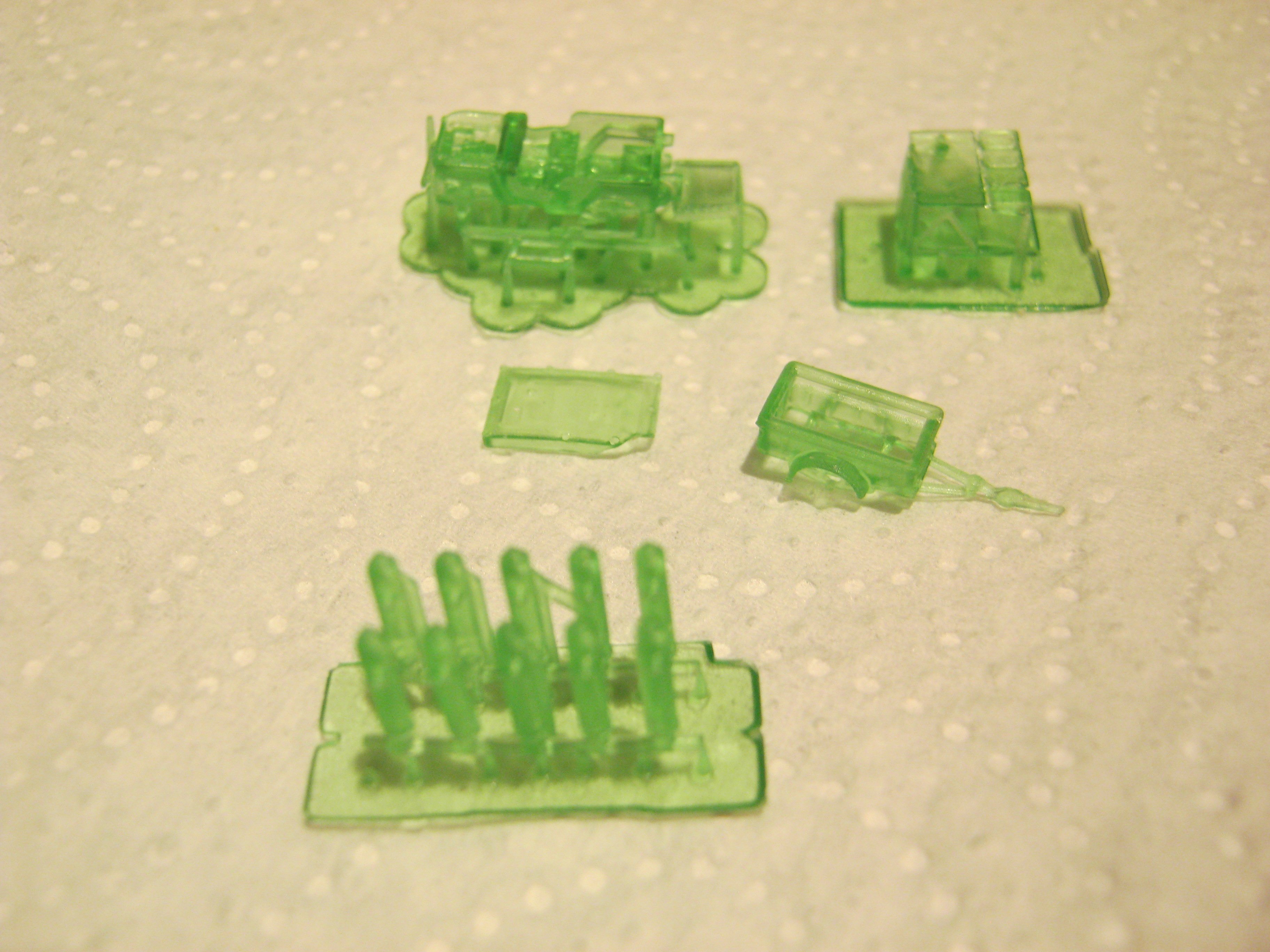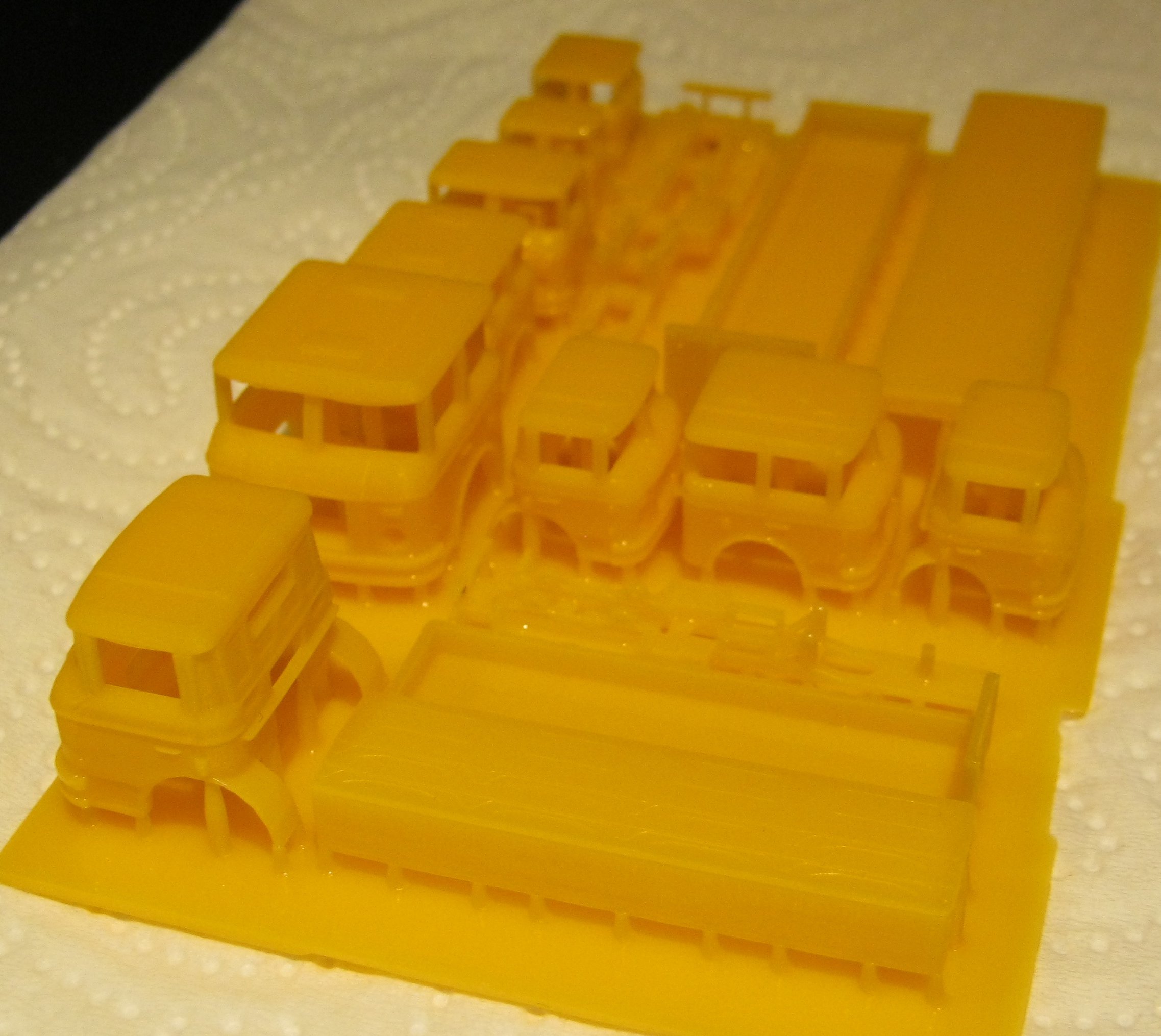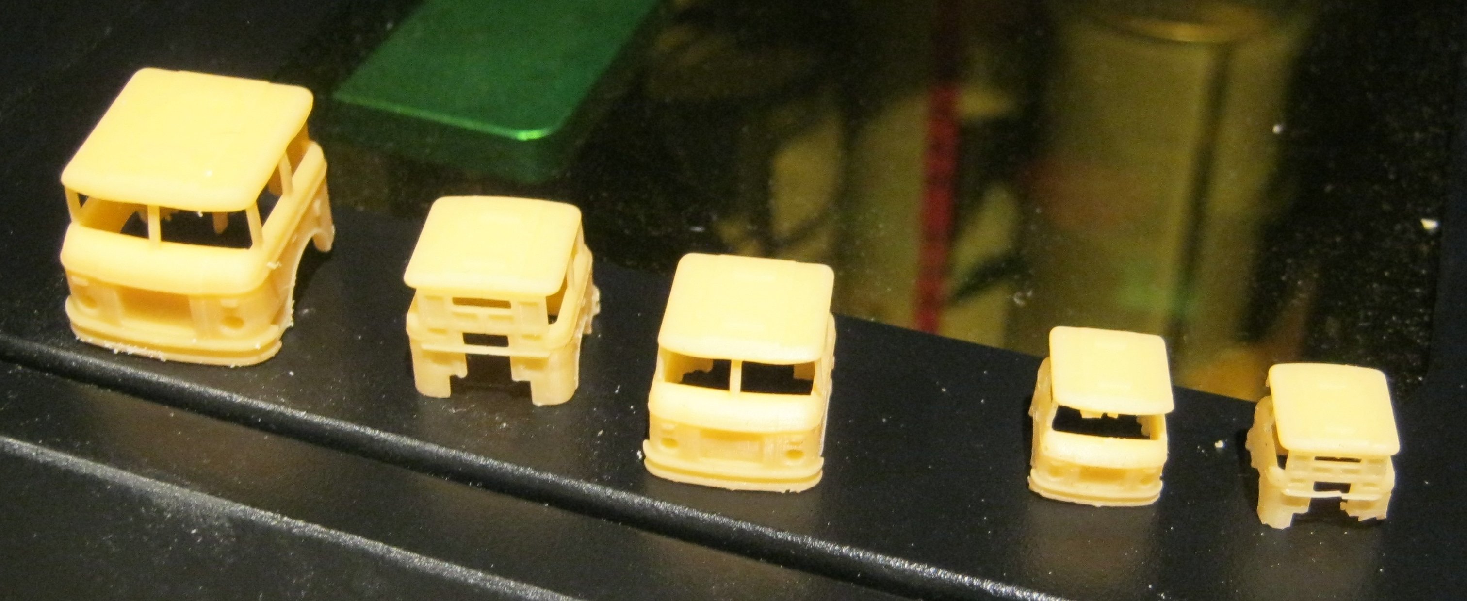 Also der Klare Harz und der mitgelieferte grümklare liefern die besten Ergebnisse, der Farbige ist wohl etwas "Zäh" und denoch weich, aber erspart etwas das Lackieren. Wenn jetzt die Karosserien fertig sind werden noch Dächer für die Kioske getestet.