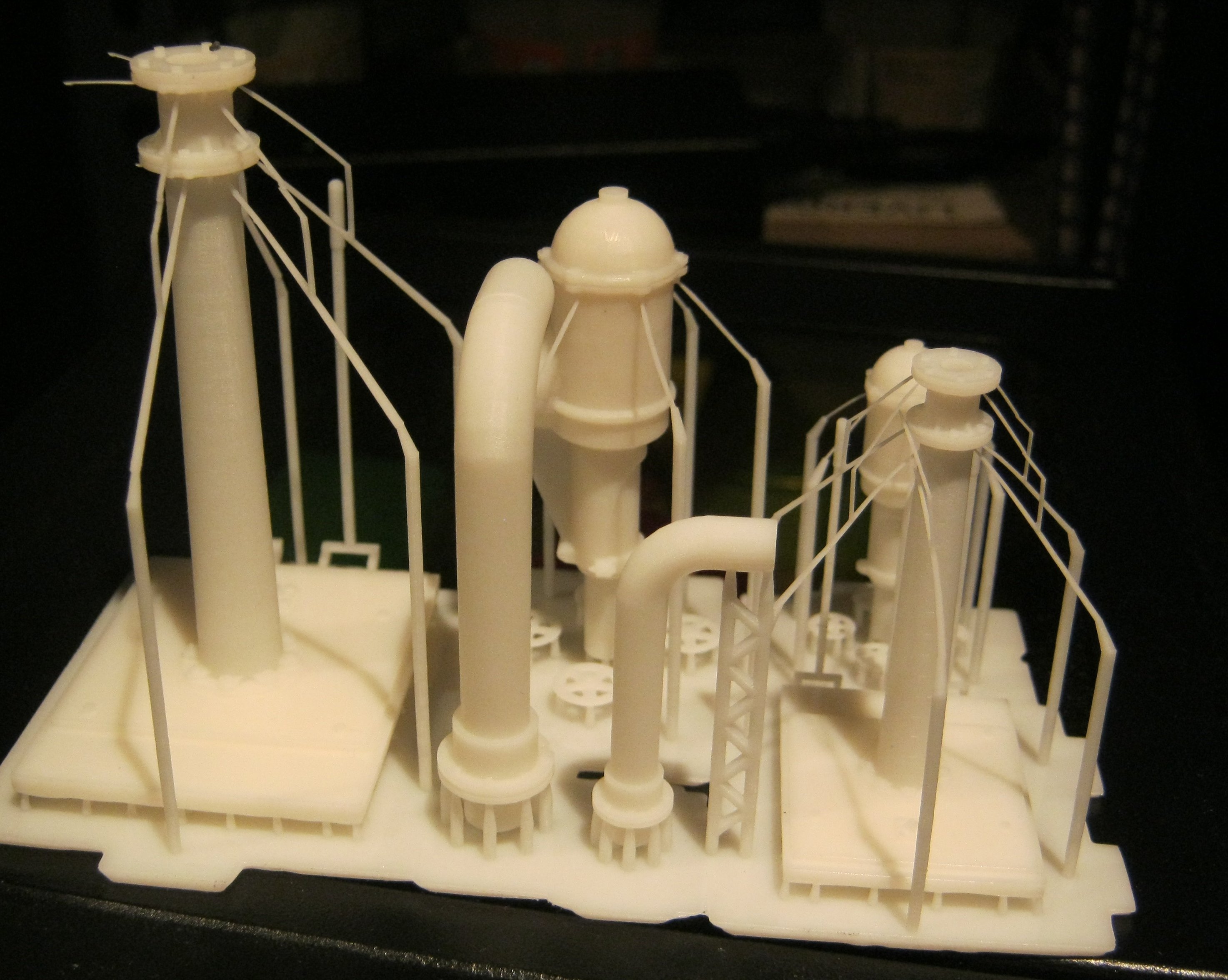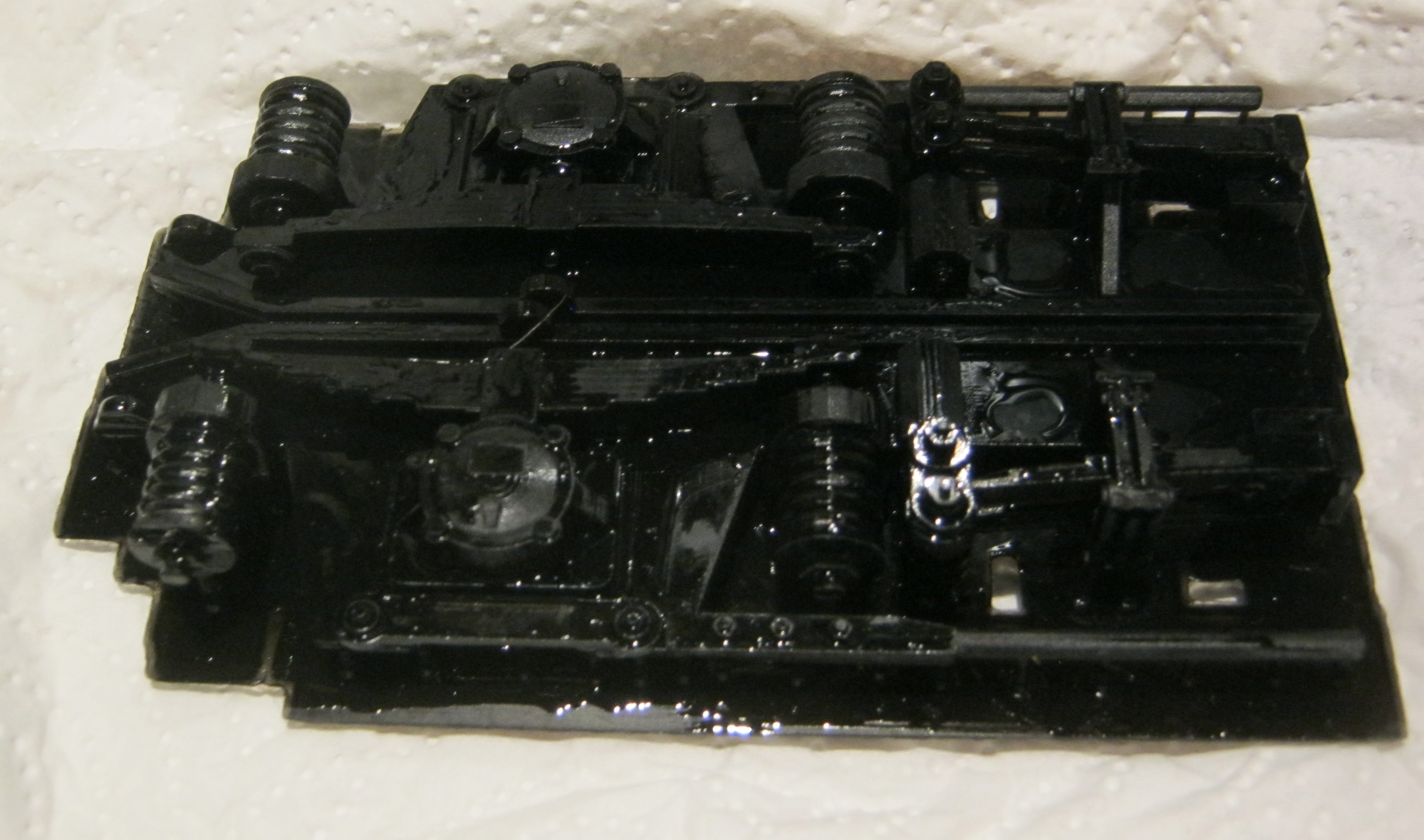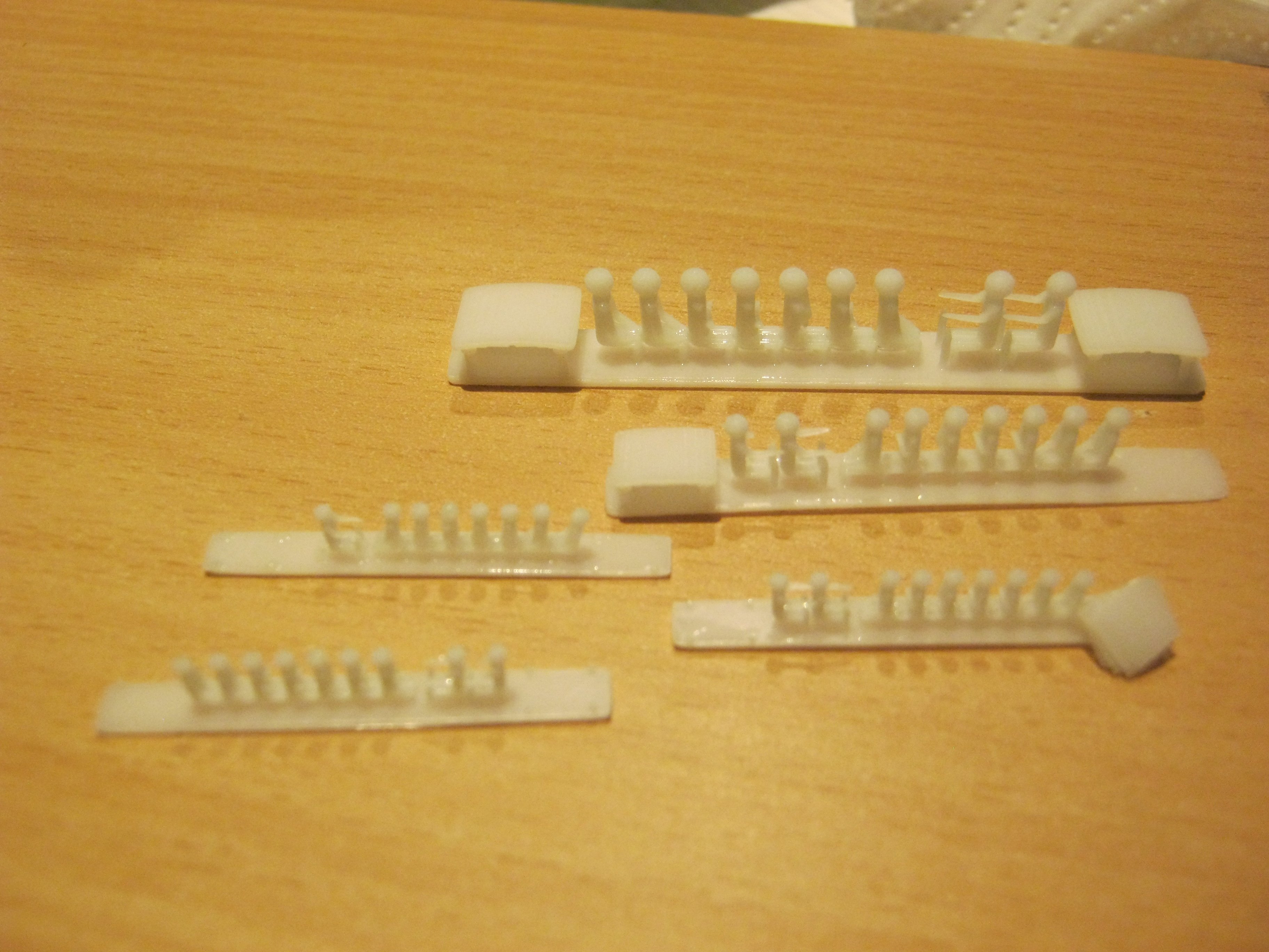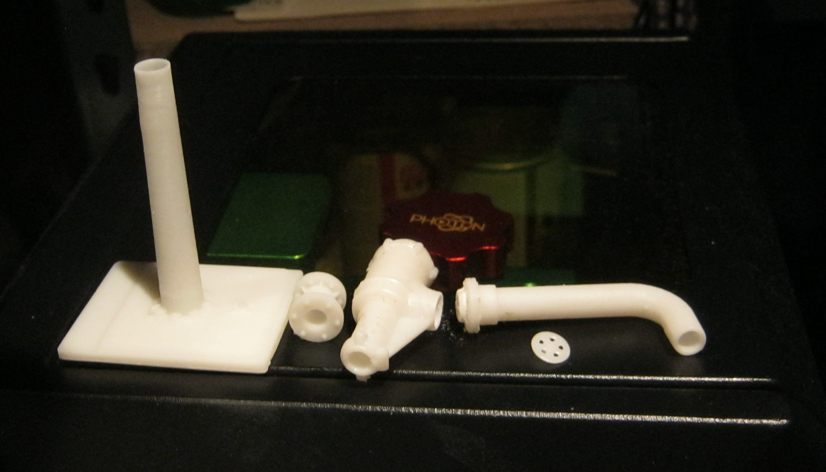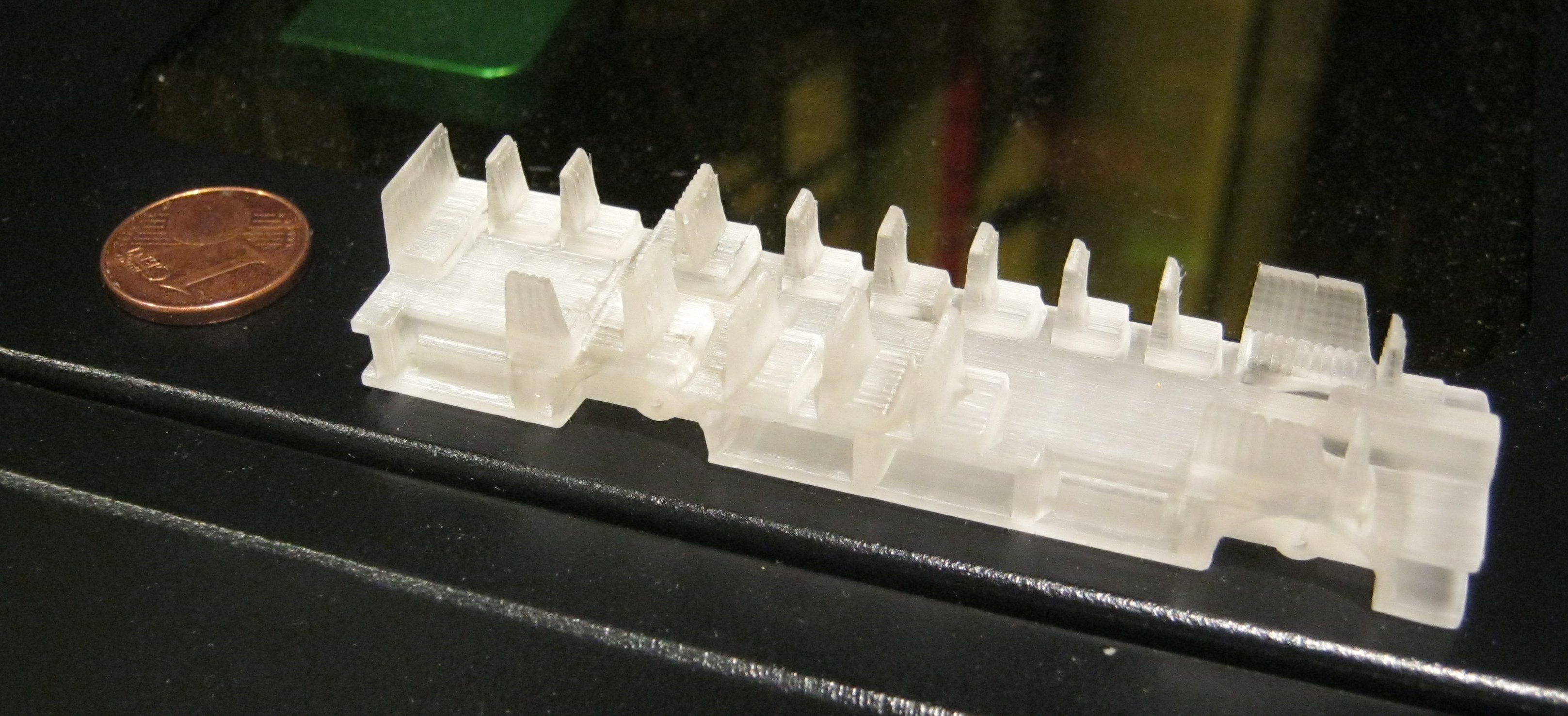 Eine Drehgestellblende für einen Doppelstockzug in Spur 2. Da der Platz nicht aus reicht, habe ich es in 2 Hälften gedruckt und will es nach dem Auslösen zusammen fügen. Da es ja nur aus Fotoresin besteht ist meine Überlegung es an den Stoßstellen mit dem selben Resin zu benetzen und dann dieses mitels UV-Licht aus zu härten. Mal schauen ob es so wird wie ich es mir vorstelle.Aber im moment ist das schwarze resin erst einmal komplett alle. Also geht es mit weiß weiter: