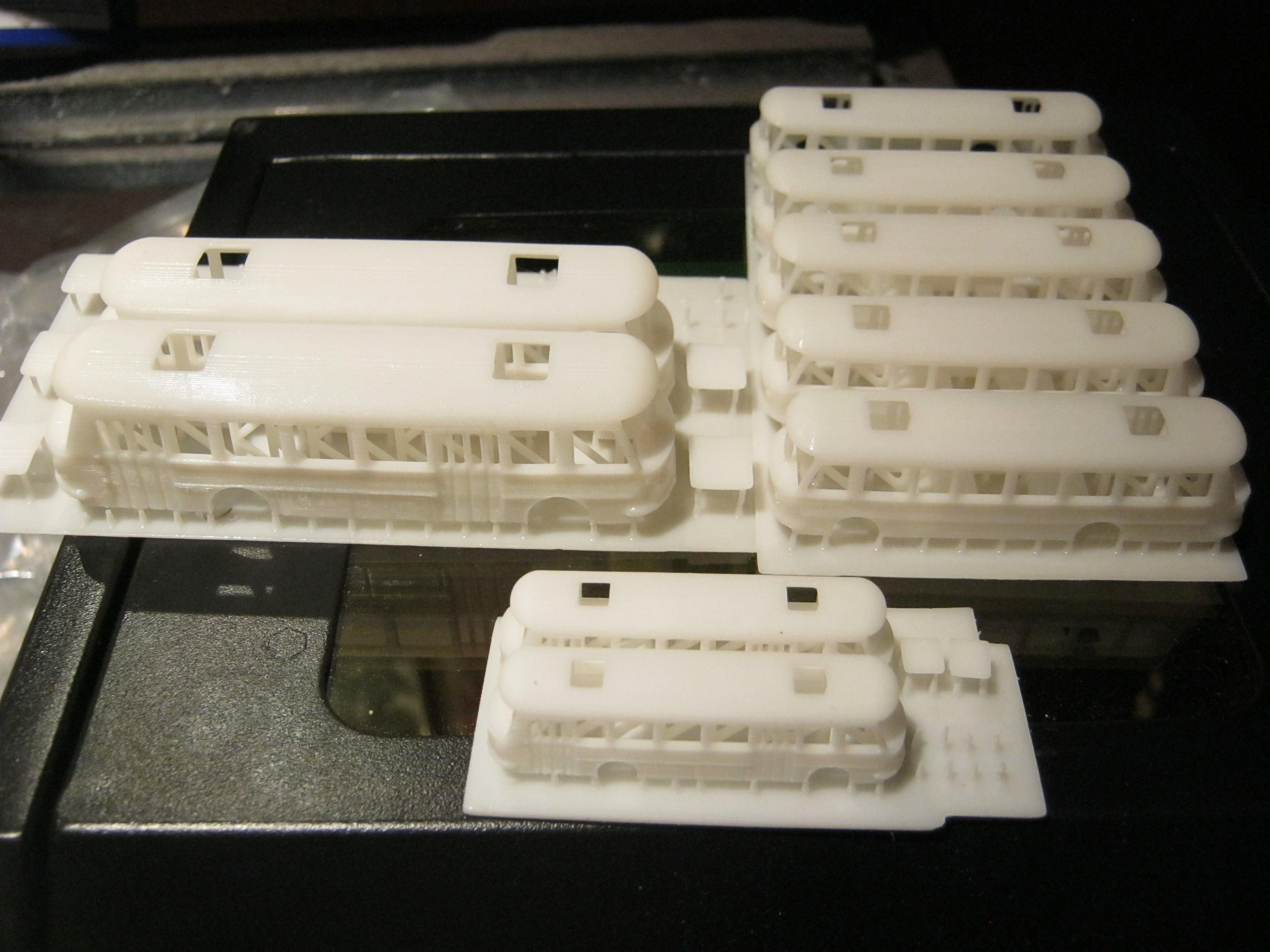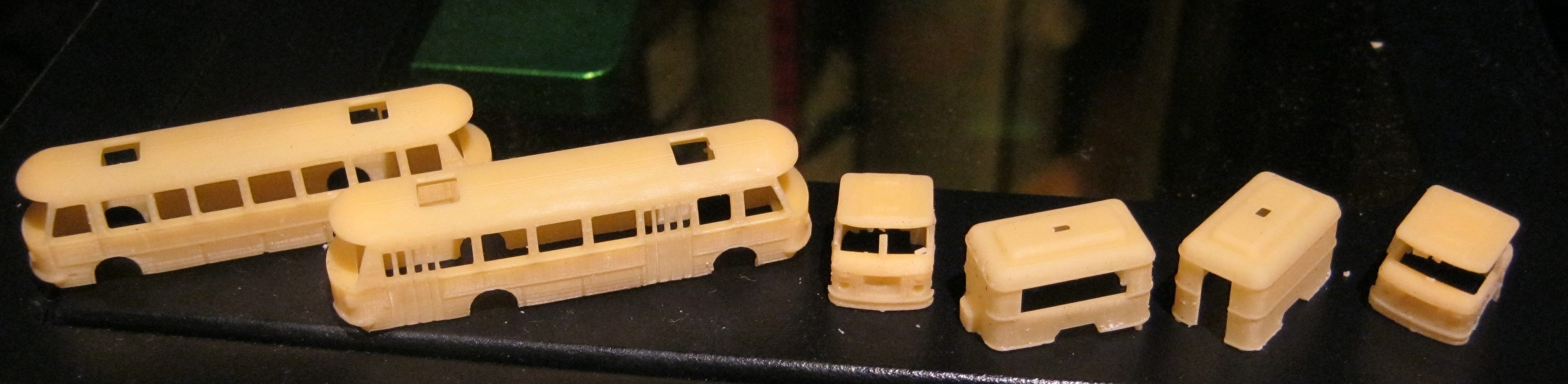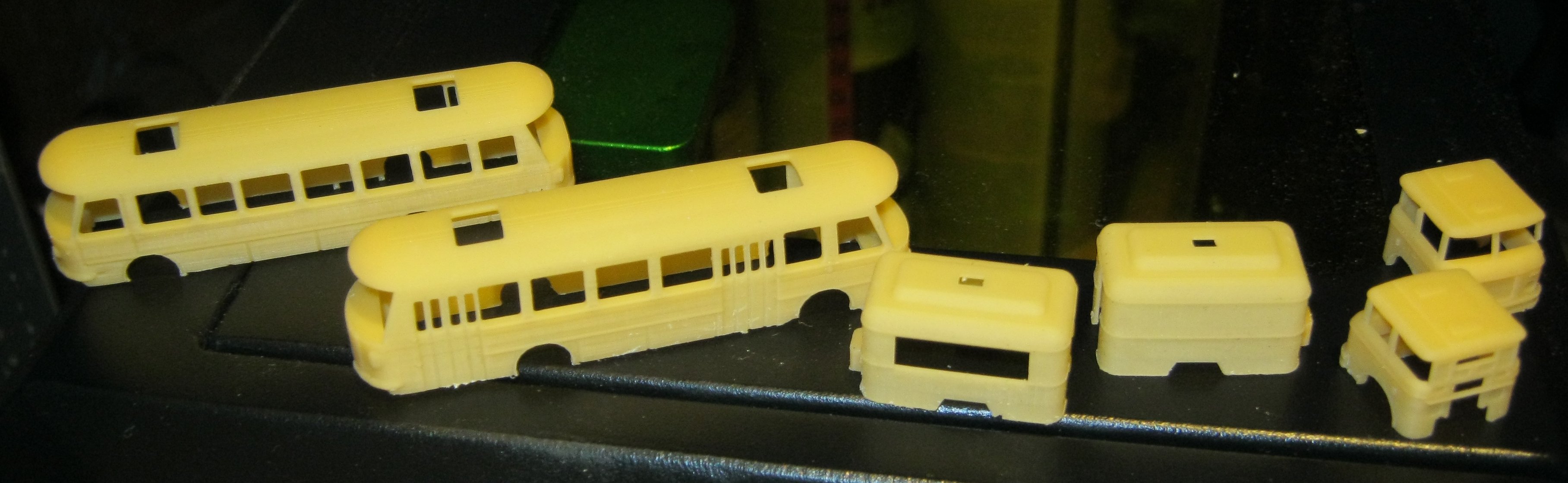 Vom Bus sind die Karosserie und die Räder Serienfertig, Fahrwerk passt zwar, hat aber noch einen kleinen makel der zwar nicht auf fällt , mich aber stört. Und dann müßen noch die Scheiben und Lampeneinsätze der Scheinwerfer getestet werden. In N habe ich noch Ätzteile von Thoros nuszurüstatz, in Z und TT muß ich die dann noch Zeichnen.   Auch bin ich am überlegen ob ich nicht auch Rückleuchten in rot-Durchscheinend drucken sollte.