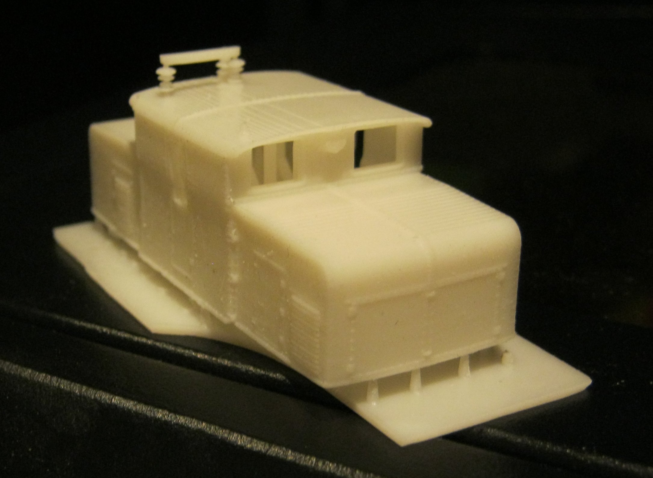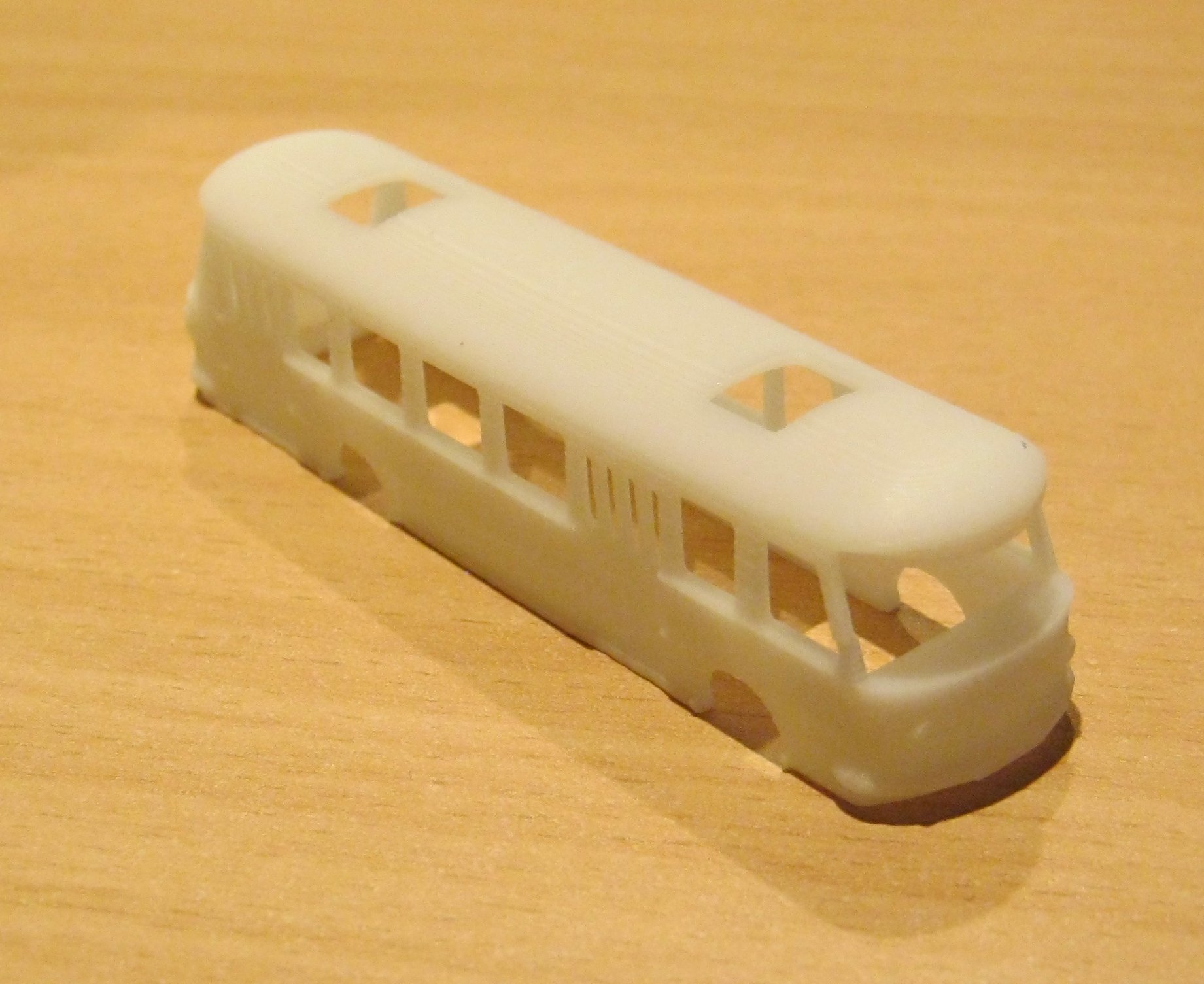 Mein Hauptanliegen: Wie klar ist das klare Harz? Für meine Appenzeller Bahnen, NDW und auch Straßenbahnen brauche ich denmächst Fenster. Die Straßenbahnen kann ich mit Folie befenstern, das geht. Allerdings fehlt mit bei Folie die Wölbung der Front- und Heckscheibe nach oben. Anbei ein Bild des Standmodells, welches ich derzeit überarbeite.