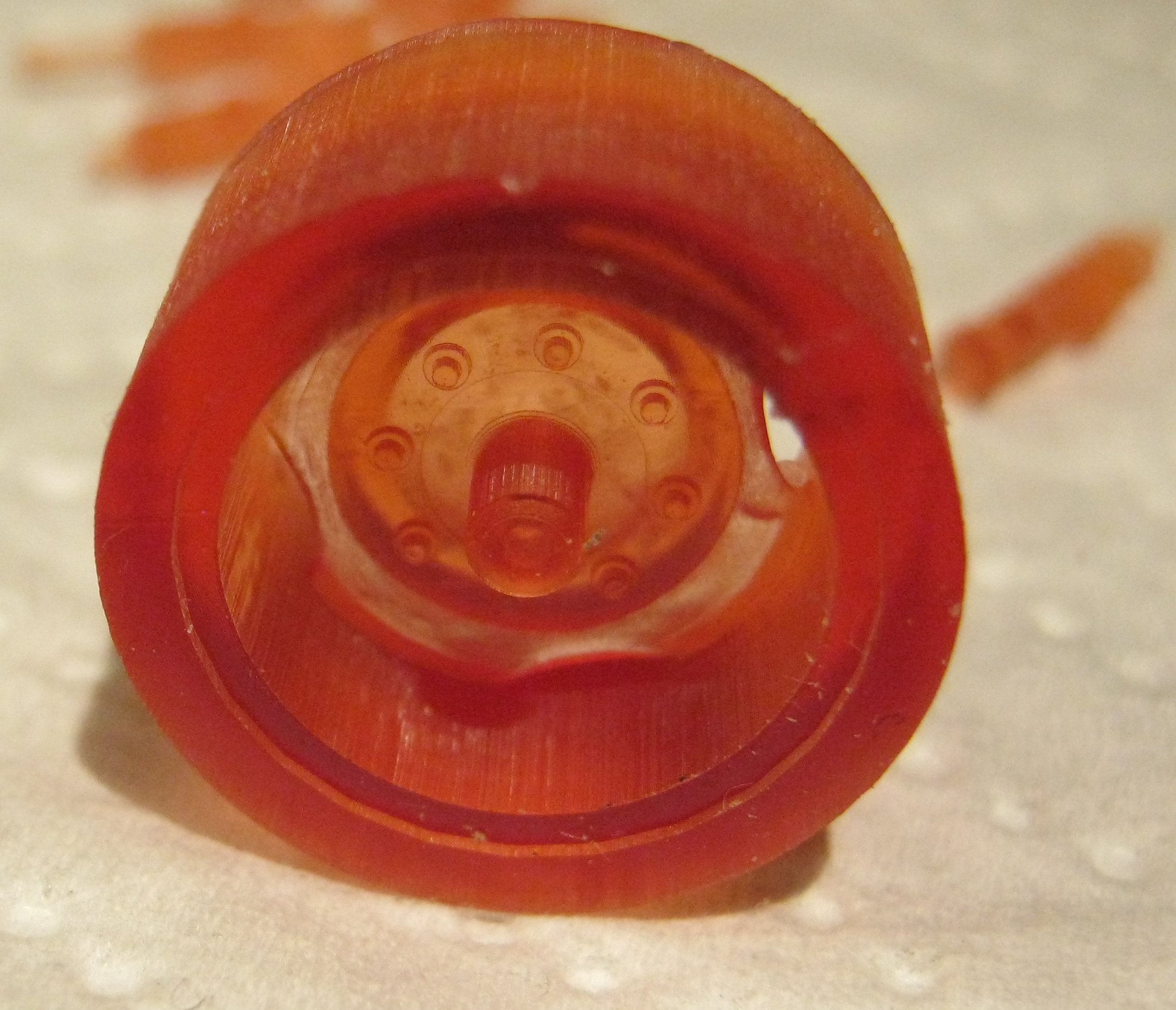Noch ein paar "nebensächlichkeiten", ich habe einen Autoscheibeneiskratzer aus hartem  Kunststoff gekauft, der eignet sich hervorragend zum Ablösen der Druckteile von der Trägerplatte. Der mitgelieferte "Spachtel"  aus Weichplaste hatte zu schnell Dellen und kam nicht richtig unter die Druckteile. Ausserdem habe ich mir noch ein paar Doppelcaffeepudings von Lidle geholt, davon brauche ich die Verpackung! (natürlich esse ich zuerst den Pudding! ;) )  Aber die ausgewaschenen trichterförmigen Becher sind idesl um da die beim Drucker mit gelieferten Filtertüten rein zu stellen. Je harzsorte einen Puddingbecher und einen dieser Filter, und wenn dann das Harz durch ist kann es wieder in die Flasche, und der rest kann in ruhe ab tropfen ( Filter und eventuell nicht am Dräger hängende Fehlstücke di an der PET-Folie hafteten und ab getragen wurden oder sowieso im Resin schwimmen weil es sich gelöst hat) . Da je Resinsorte ein Becher und ein Filter genommen wird, kann ich die Filter mehrfach nutzen. mal sehen wie lange so ein Trichter hält. zumindest so lange er nicht ins UV-Licht kommt müßte er so lange nutzbar sein wie das gefilterte Resin.