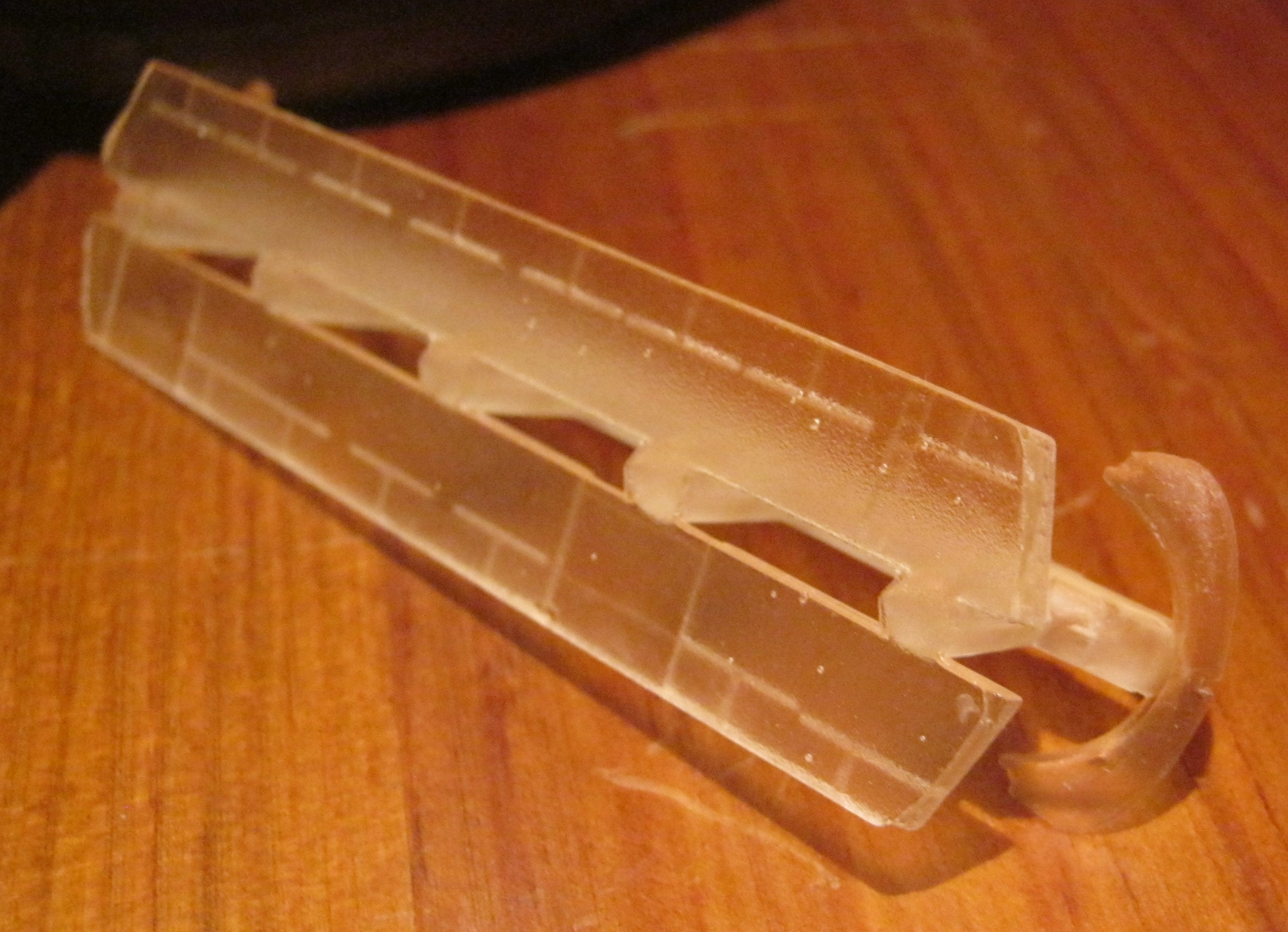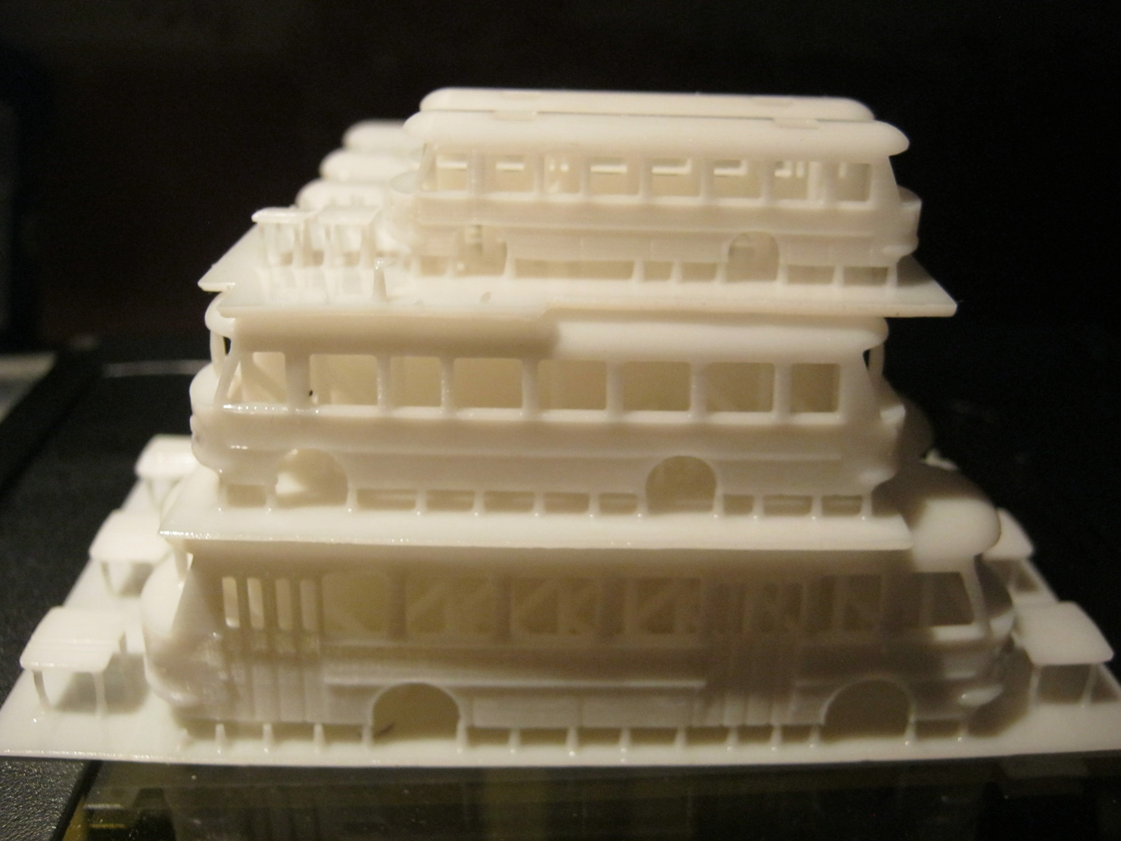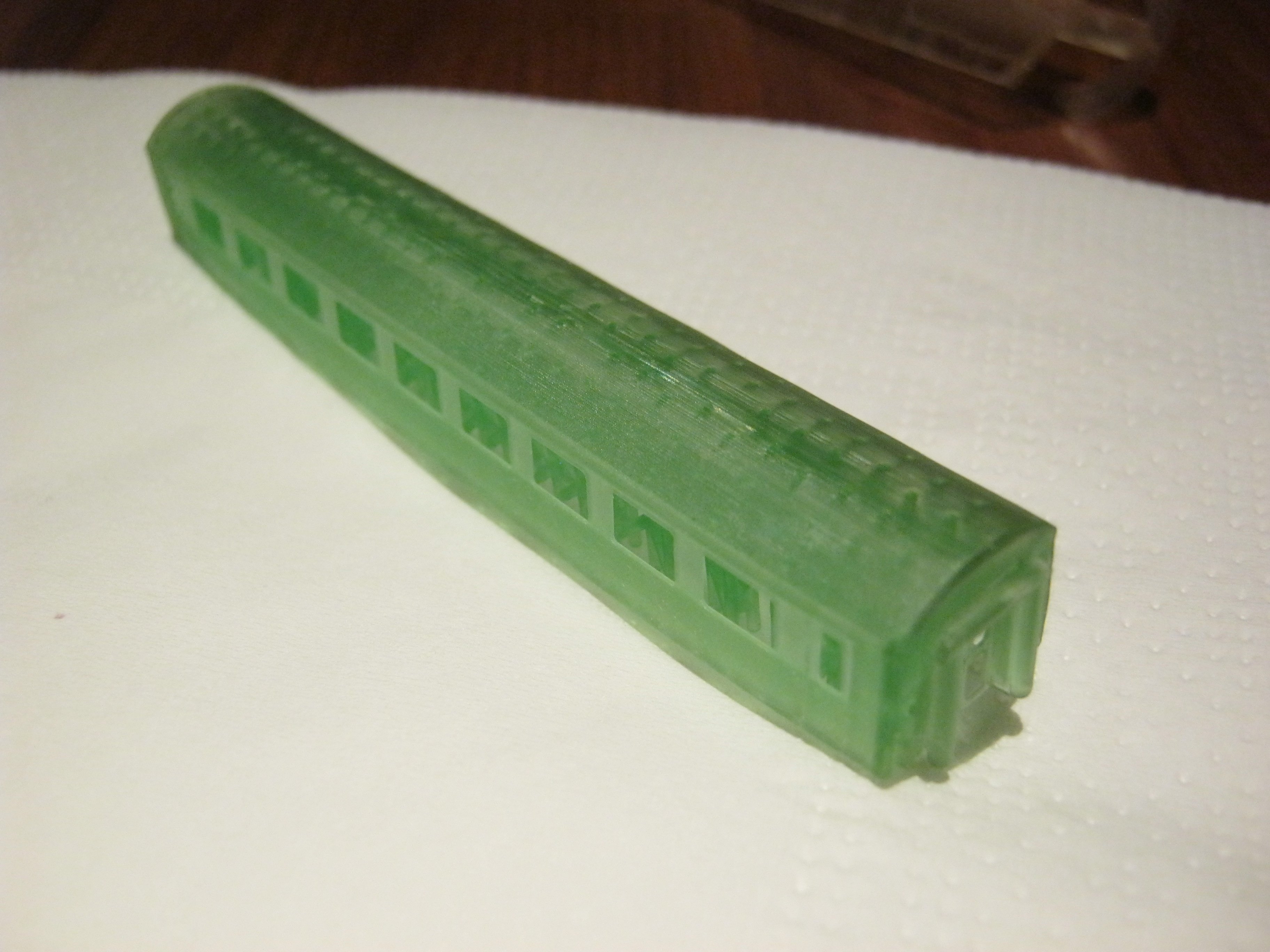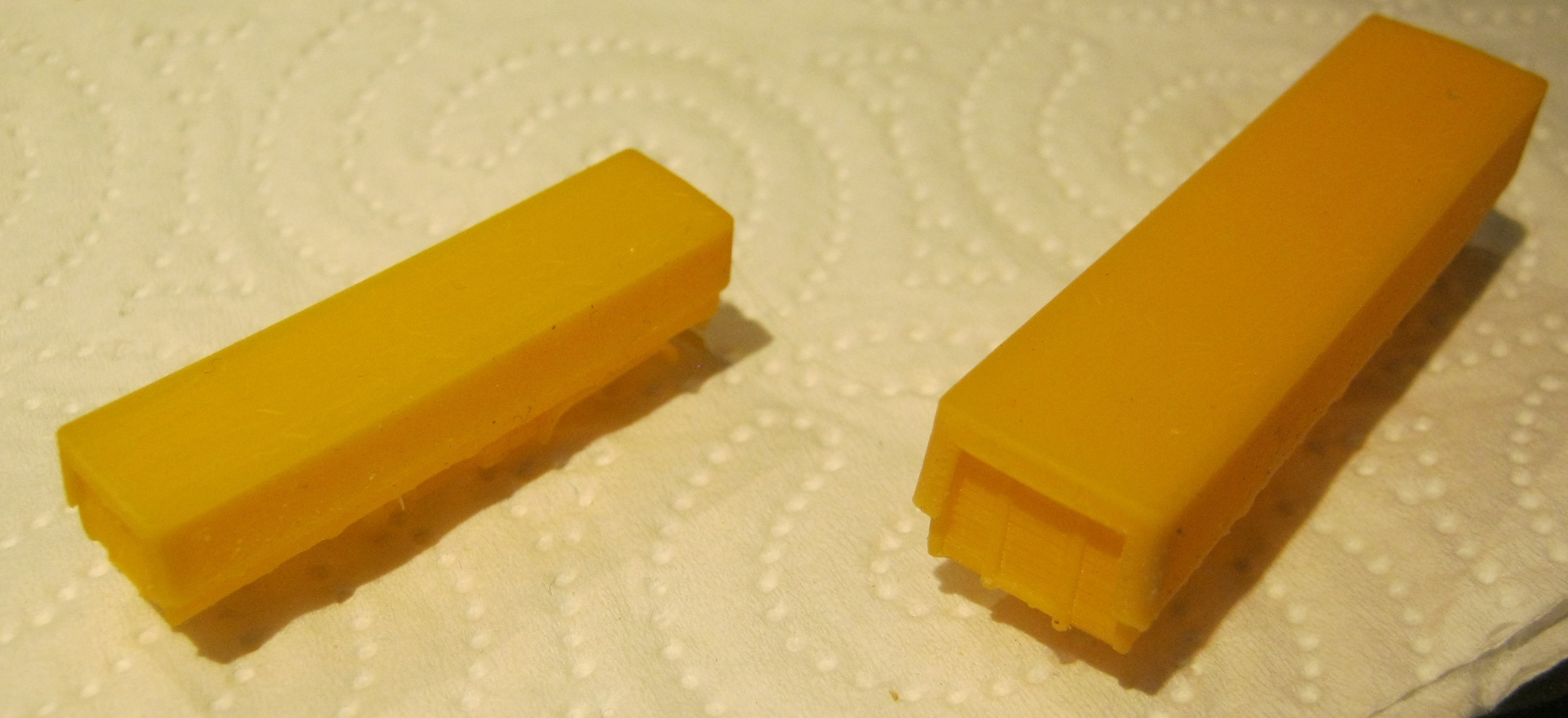 Ja, Shapeways hat mittlerweile saftige Preise aufgerufen, aber die Dächer des RTO sind auch nicht wirklich besser. Die Schichten sind auch hier sichtbar. Eine Kritik muss ich aber trotzdem loswerden: Die Form stimmt überhaupt nicht, Front und Heck sind auch nach oben gewölbt und das Dach liegt auch nicht in der Form. Mit dieser Konstruktion verschwendest Du nur Zeit und Geld(wertes Material). In diesem Bild ist es sehr gut sichtbar, was ich meine.
