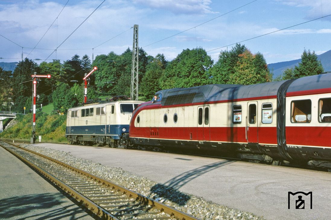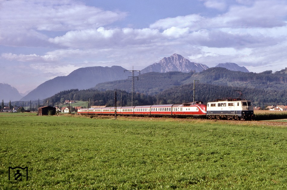 Bildtext:Unter Zuhilfenahme von 111 072, die auf dem Steilstreckenabschnitt bis Bad Reichenhall-Kirchberg für die nötige Bremsleistung sorgte, fährt Dt 13424 aus Bayerisch Gmain. (22.09.1981)
