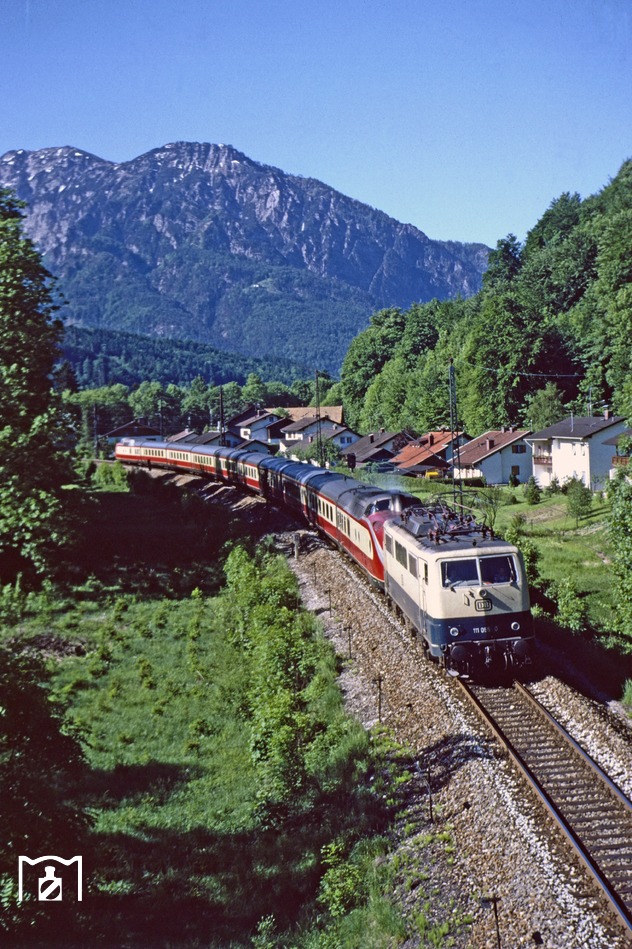 Bildtext: ... Hier ist 601 014 mit Unterstützung von 111 055 als Dt 13424 (Berchtesgaden - Dortmund) bei Bad Reichenhall unterwegs. (29.05.1979)