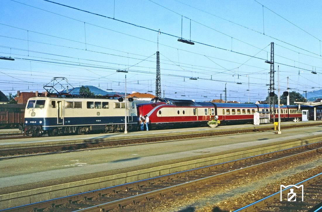 Bildtext: Um 17.54 Uhr ist Dt 13425 aus Dortmund in Freilassing eingetroffen. Für die Fahrt nach Berchtesgaden erhält 601 015 Vorspann von 111 024. (22.09.1981)