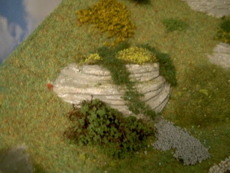 Dann wieder ein dunkleres Grau mischen, Felsen anstreichen, danach ein Dukles "Moosgrün" mischen, an einigen Stellen mit einem "Halb-" trockenen Pinsel einige Stellen bemalen, (mit leichtem Druck). Als letztes Glanzlichter setzen, wie oben beschrieben, mit einem trockenen Pinsel und heller Farbe.