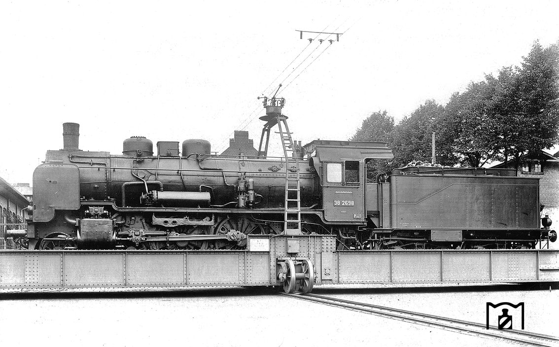 38 2698 mit Caprotti-Ventilsteuerung (Antrieb über rotierende Wellen) auf der Schiebebühne des Bw Berlin-Grunewald. 1932 wurde die Ventilsteuerung System Caprotti wieder gegen eine Heusinger-Steuerung getauscht. (1931) Foto: DLA Darmstadt (Maey)