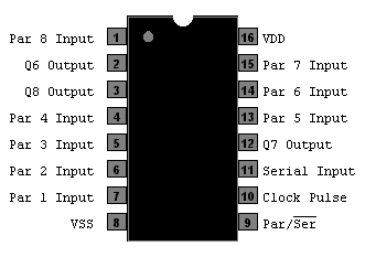 Die Pins werden dann um den IC herum gezählt, also rechts unten dann Pin 8 (minus bei Logikreihen wie TTL und CMOS) und links oben ist dann Pin 16 (plus bei Logikreihen wie TTL und CMOS)