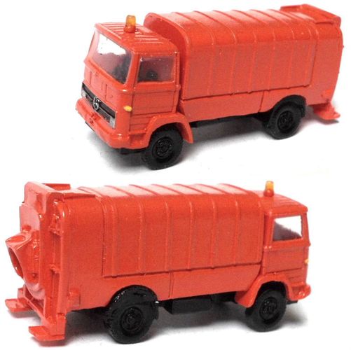 Das erste Bild zeigt einen Rotopress, wie er nur wenige Jahre gebaut wurde. Die Seitenwände sind senkrecht,nur die unteren Klappen sind nach innen abgewinkelt. Das Heckteil ist eckig. Das perfekt passende Führerhaus wäre der Mercedes NG oder auch ein MAN F8, oder wie auf dem Bild der Mercedes LP mit kubischer Kabine, hier mit Schiebetüren, das war auch typisch für Müllwagen.