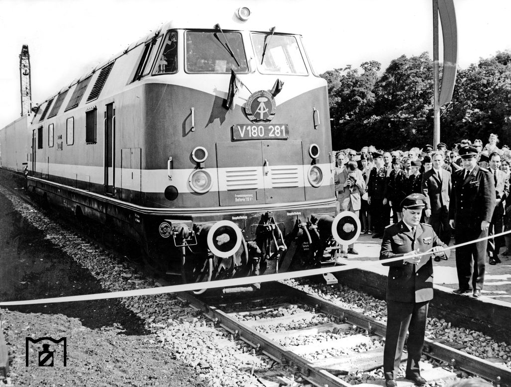 Feierliche Freigabe des ersten geschlossenen Containerzugs der Deutschen Reichsbahn, der aus 10 R-Wagen für je drei Container bestand und auf der Verbindung Rostock - Berlin - Dresden verkehrte. Zuglok war V 180 281 des Bw Dresden. (29.06.1968) Foto: Historische Sammlung der Deutschen Bahn AG