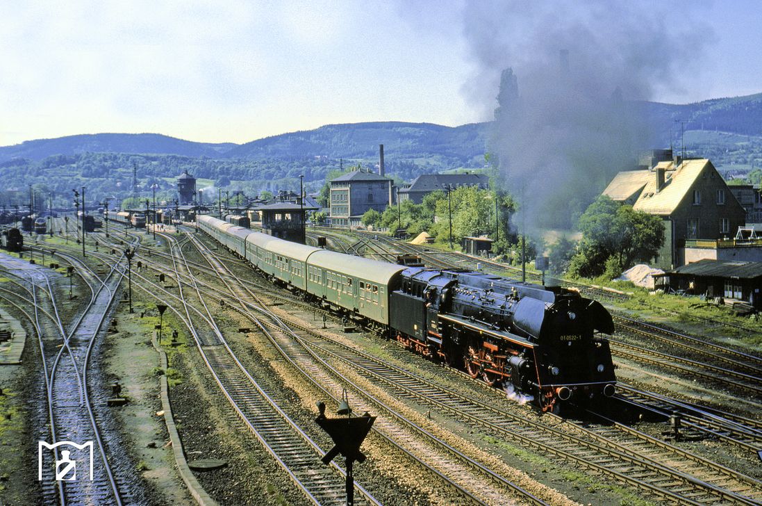 Text: Blick von der bekannten Fotobrücke am Bahnhof Saalfeld (angesichts der vielen Fotografen auch als "Affenfelsen" bezeichnet) auf die mit D 504 nach Halle ausfahrende 01 0522. (06.1981) Foto: Will A. Reed