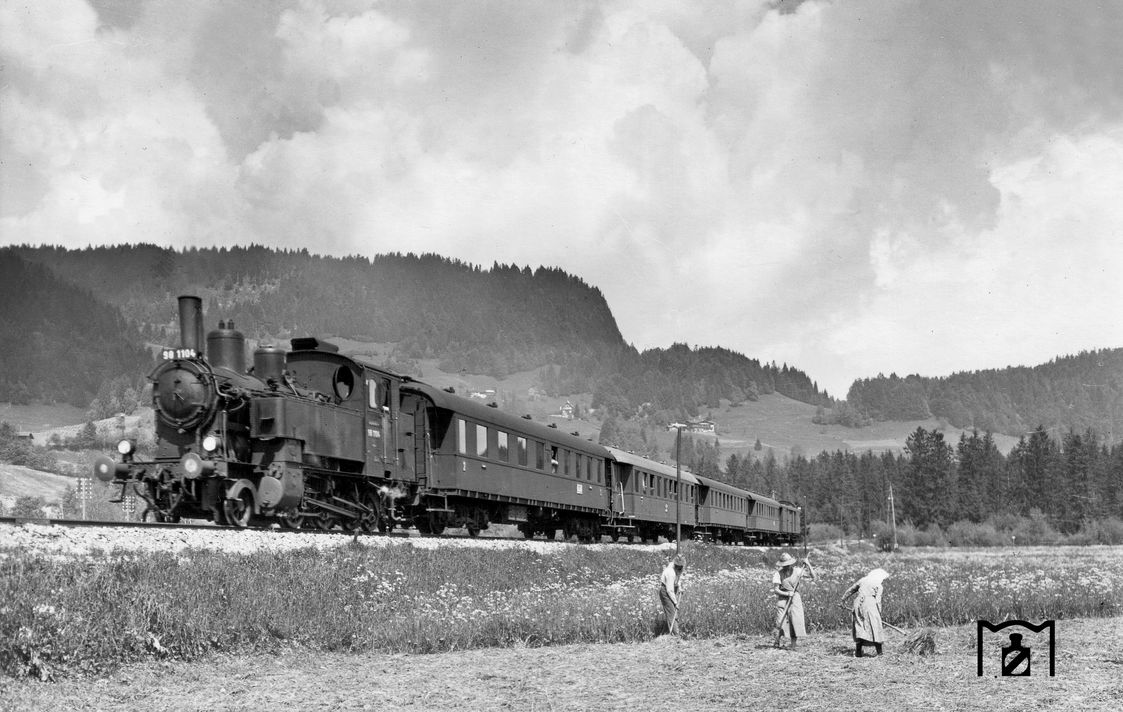 98 1104 mit den Kurswagen des D 179 aus Eger kurz vor Oberstdorf. Die Aufnahme entstand am Bahnübergang von der heutigen Rubinger Straße aus, unmittelbar am Ortseingang von Oberstdorf. (09.06.1939)