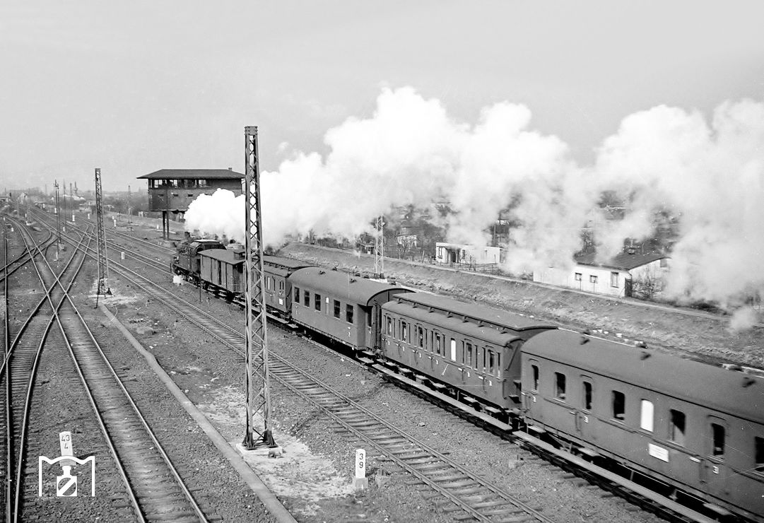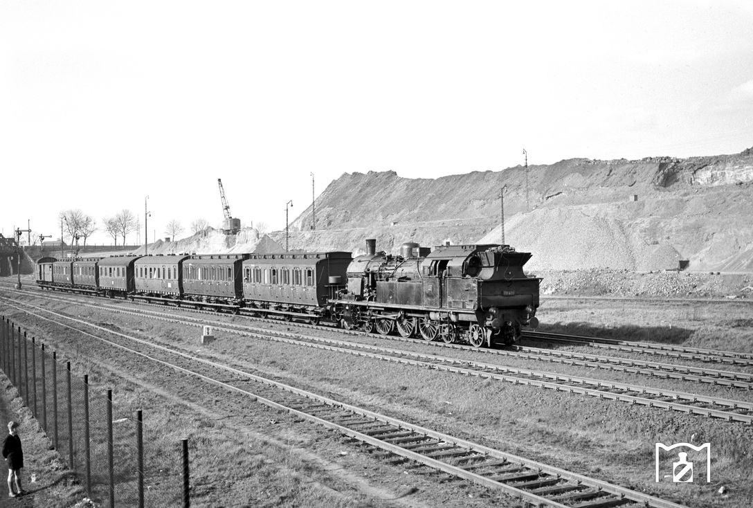 Der Aufnahmeort kann ziemlich genau bestimmt werden: Kommend von Köln ist der Zug unterhalb der Kasselburg unterwegs und erreicht in Kürze Gerolstein. Leider versteckt sich an diesem Tag die Sonne, so dass man durch fehlenden Schattenwurf keine Rückschlüsse auf die Tageszeit nehmen kann. Es kommen aber nur wenige Züge in Betracht: Zwei P-Züge, aber auch der E 154 Köln-Saarbrücken, der gegen 17:30 Uhr Gerolstein erreicht.