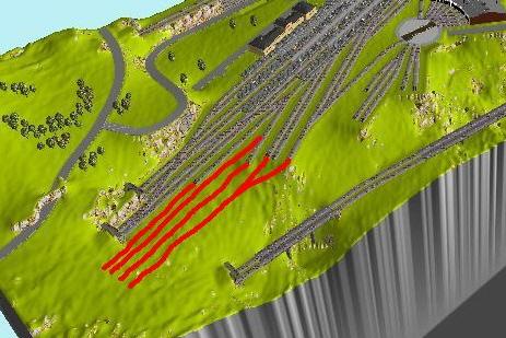 - Die Paradestrecke am vorderen Rand ist deutlich tiefer als der Rest der Gleise; kein Problem damit. Die eingezeichneten Brücken könnten Dich allerdings zu einem etwas unglaubwürdigen Gelände zwingen...