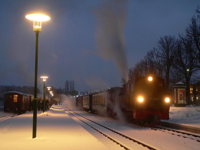 Auch die Dampflok hier hat gegenüber der Bahnsteigbeleuchtung eher ein gelbes Licht