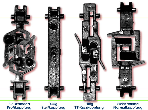 Vergleich der Kupplungen (Fleischmann Profikupplung, Tillit TT-Steifkupplung, Tillit TT-Kurzkupplung und Normkupplung von Fleischmann):