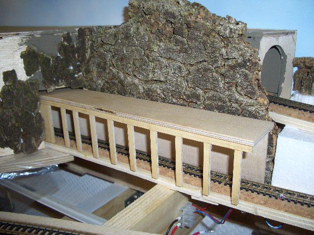 das Thema Landschaftsgestaltung scheint im Augenblich ganz aktuell zu sein. Auch ich bin dabei, einen etwas kleineren Bogen mit unschönen Weichen zu kaschieren. Dazu habe ich mir einen abnehmbaren Bergteil ausgedacht. auf der einen Seite sind eine normale Tunneleinfahrt geplant und eine Einfahrt mit einem Schutzüberbau gegen Steinschlag. Die Felswände sind aus Korkrinde.