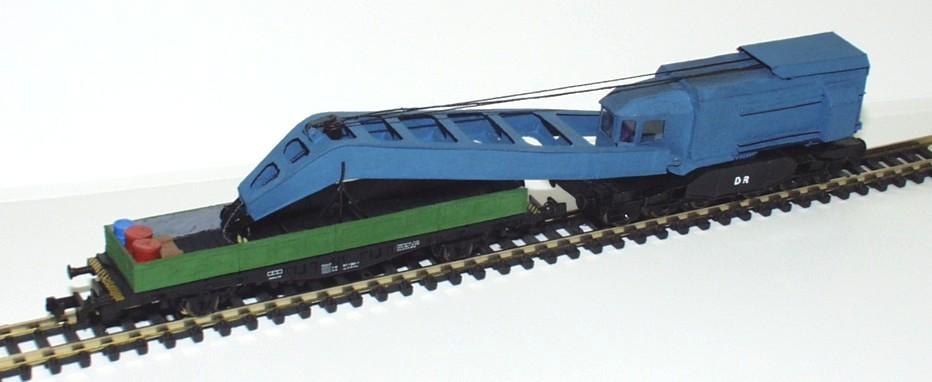 Der Kran entstand in Pappbauweise nach einer H0-Bauanleitung im Modelleisenbahner, der Beiwagen ist ein Umbau eines 2achsigen Fleischmann-Containerwagens.