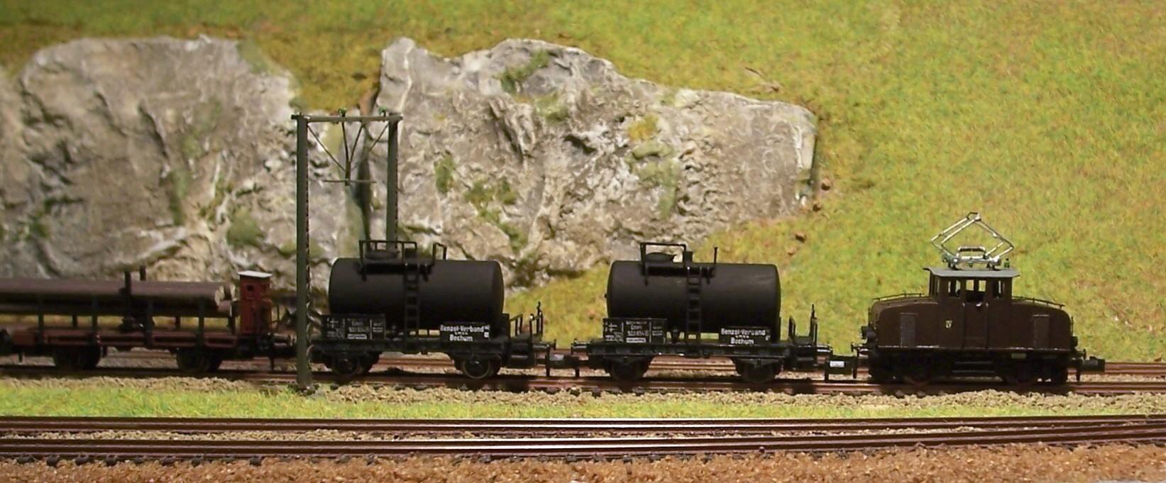 Die angehängten Wagen entstanden aus preiswert im ebay erstandenen defekten Wagen von Fleischmann und Roco.