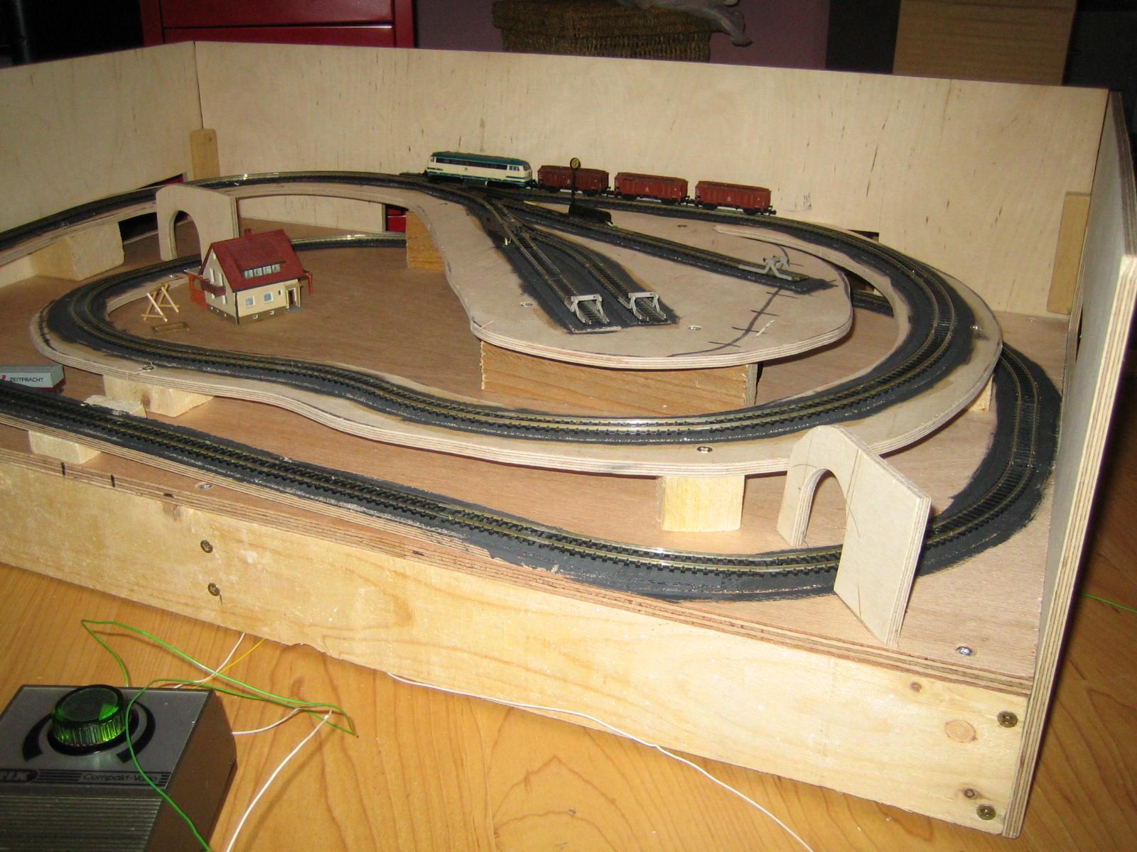 Da das Strangulieren von Postbeamten ein Bundesvergehen ist, und die unser neues Bundesgefängnis noch nicht ganz fertig ist, hatte ich meine Planung von Gleislegen auf Hintergrundmalerei verlegt.
