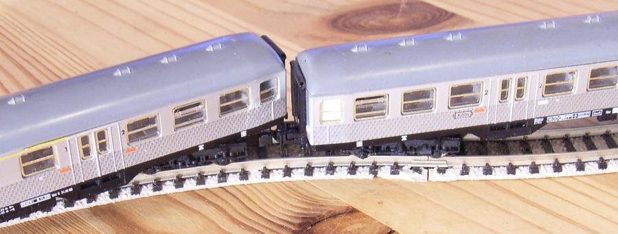 Hab da Profikupplung 9543 reingebaut. Die Wagen kommen damit deutlich näher, gehen sogar berührungsfrei durch R1. Das Verhalten am Hang (Wechsel von Eben zu Steigung/Gefälle) muss ich aber noch einmal austesten...