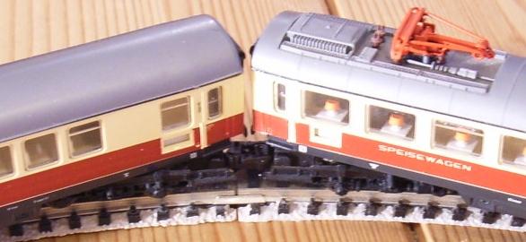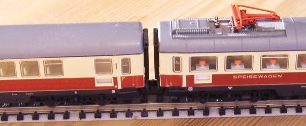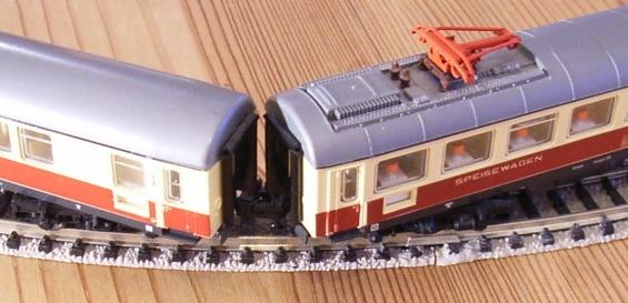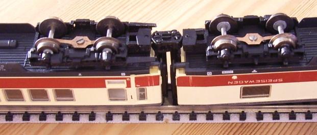 Ich kupple immer 2 lange (oder 3 kurze) NEM-Schacht-Wagen mit der Stange 08827 und setze dann dazwischen eine Kupplungsverbindung mit der 08828. An den Zugenden dann GFN 9545. So kann man besser aus der Vitrine oder nach Unfällen auf-/abgleisen.