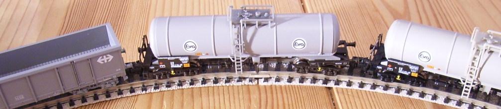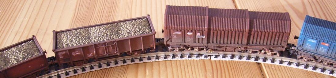 Die gezeigten Waggontypen sind sämtlich mit der Profikupplung 9543 umgerüstet. Sie wurden auf der Geraden gekuppelt und über die komplette Strecke geschoben und gezogen, ohne das sich die Puffer verhakten. Ich habe die Wagen nicht direkt angefasst, sondern mittels eines davor gesetzten Wagens: GFN 8316 (SBB Gs mit KKK und Steckerbse).