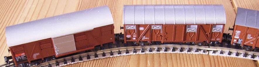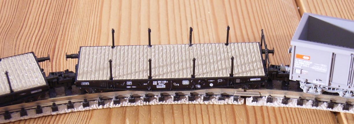 In der Regel sind bei mir genügend Wagen ohne KKK auf der Platte, die an diese Wagengruppen gehangen werden oder einzeln rumrangiert werden können. Damit diese Wagen auch einen möglichst geringen Pufferabstand aufweisen, habe ich dann soweit als möglich die GFN 9543 eingebaut.