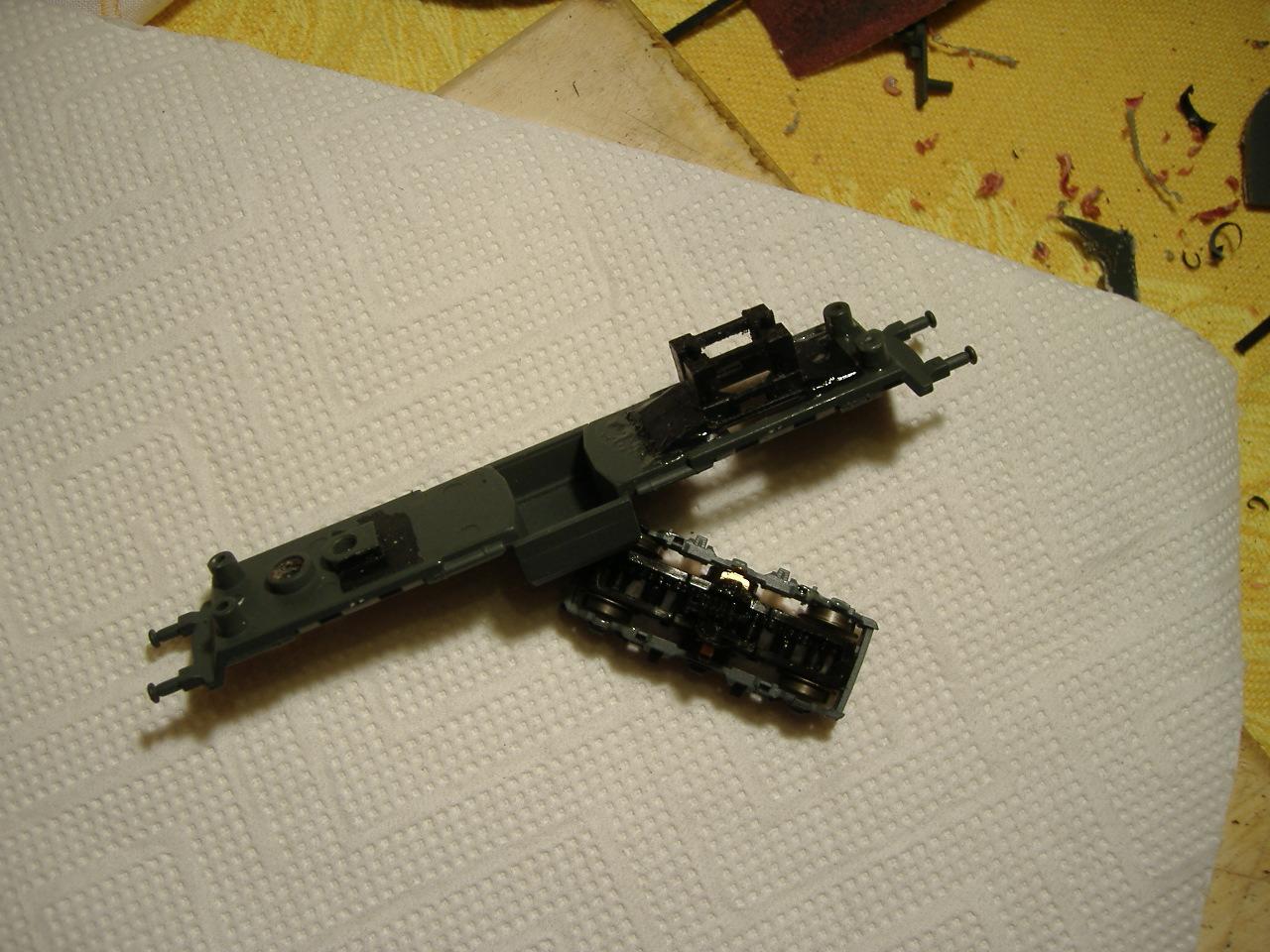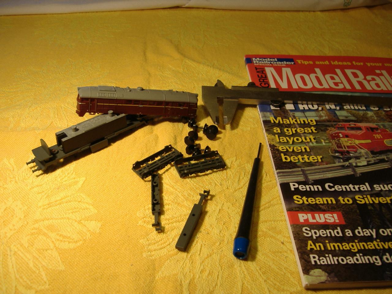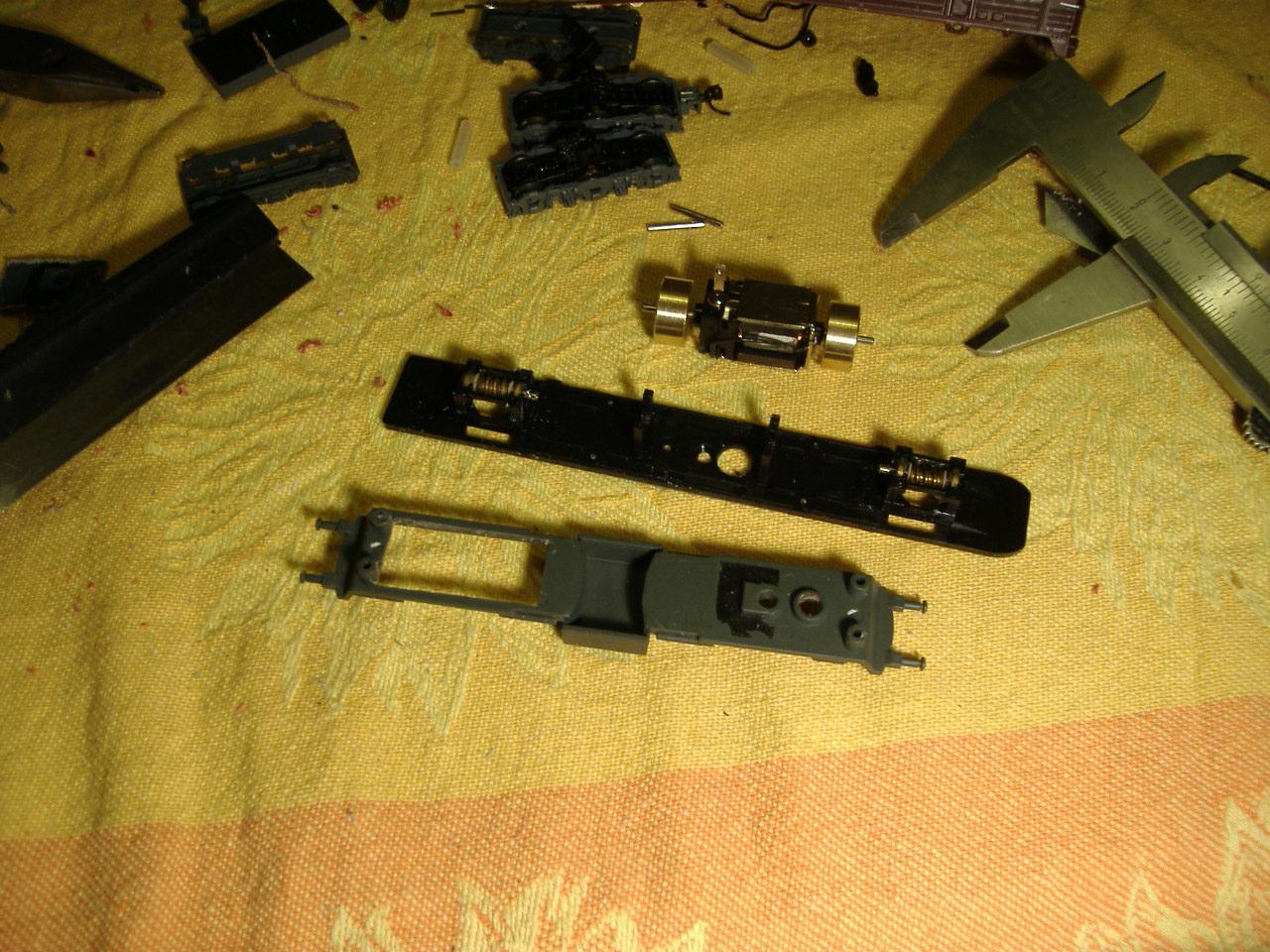 Habe angefangen eine Taigatrommel von Weltbild zu motorisieren.Habe ein Fahrwerk von einer Life Like E6 hergenommen und die Aufnahmen für die Drehgestelle abgeschnitten.Dann habe ich diese Teile in das Fahrwerk der Taigatrommel eingepasst.Radstand der Drehgestelle stimmt,nur es müssen die Blenden dann noch angebracht werden.Im Moment kann ich den original Life Like Motor nicht einbauen da er zu lange ist mit den beiden Schwungmassen.Mal sehen ob ich einen kürzeren finde oder ich auf die Schwungmassen verzichten(ungerne)werde.Ein paar Bilder vom jetzigen Zustand.Wenn ich weiterkomme melde ich mich wieder.