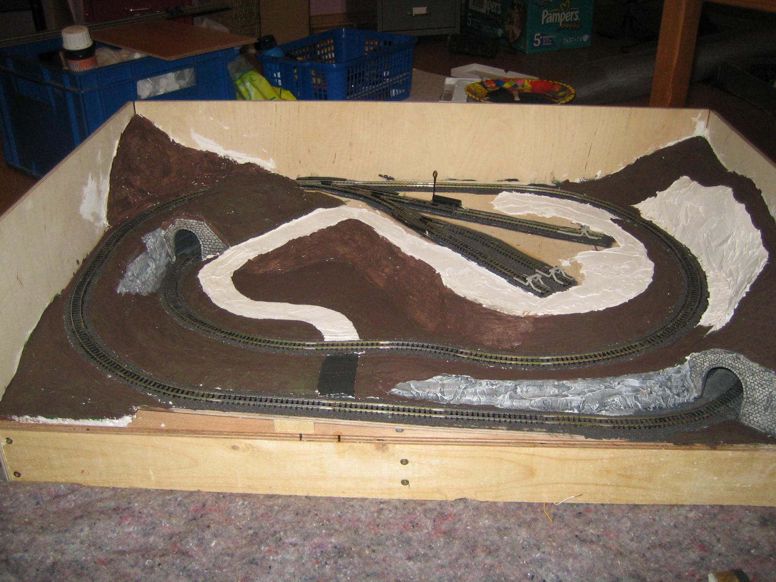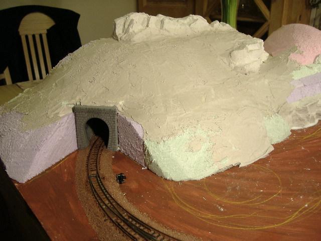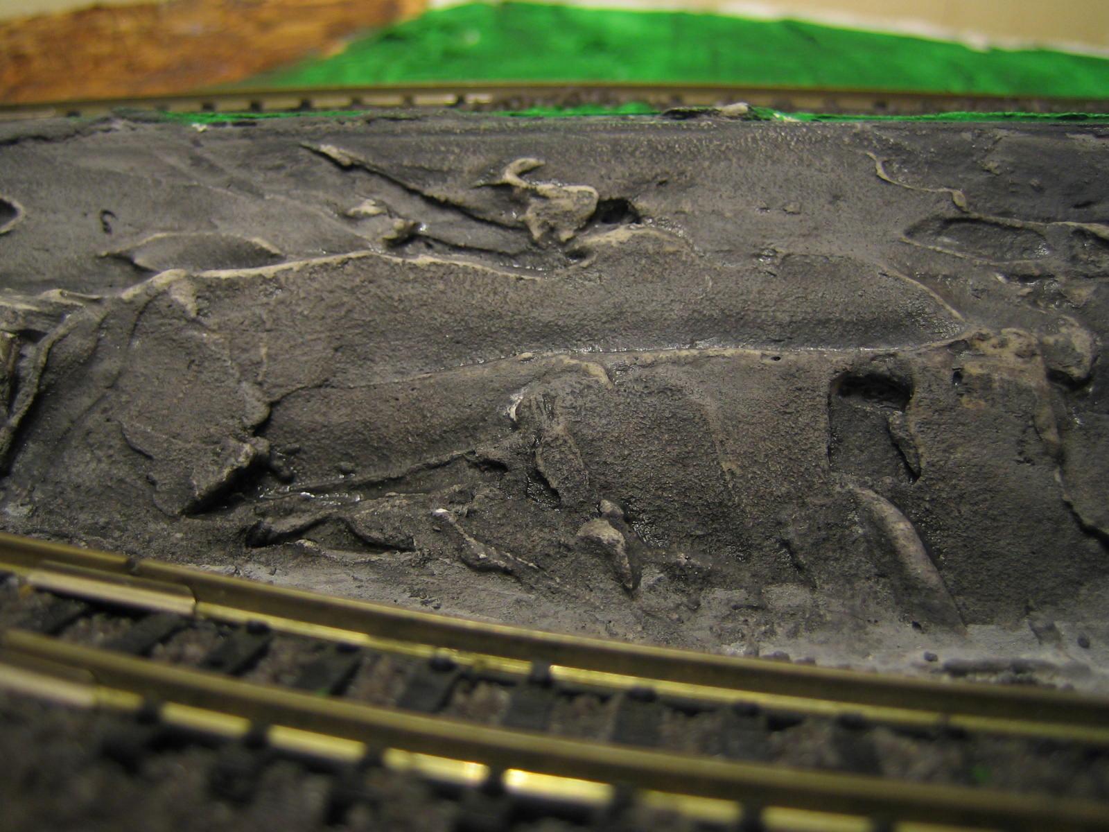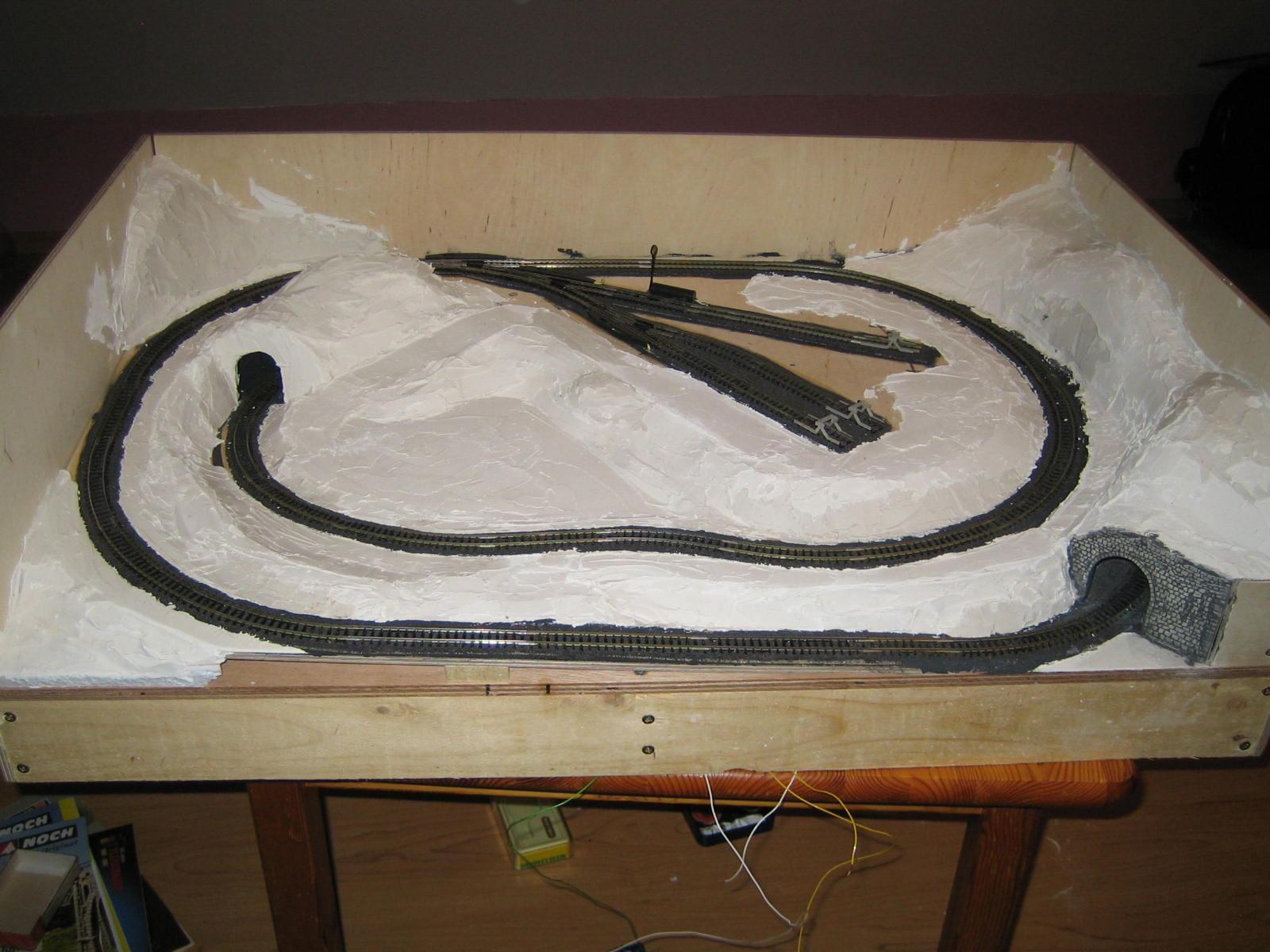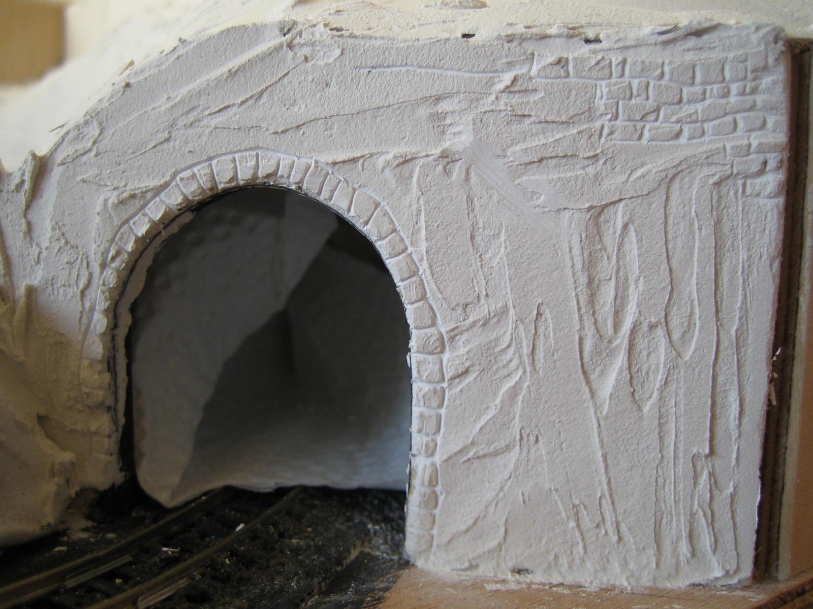 Da ich mir keine Tunnelportale kaufen wollte, habe ich mir selbst welche aus Holz gefertigt und mit Spachtelmasse "verkleidet". Anschließend eine Mauerstruktur mit dem kleinen Schraubenzieher in ca. 2 Std. eingearbeitet.