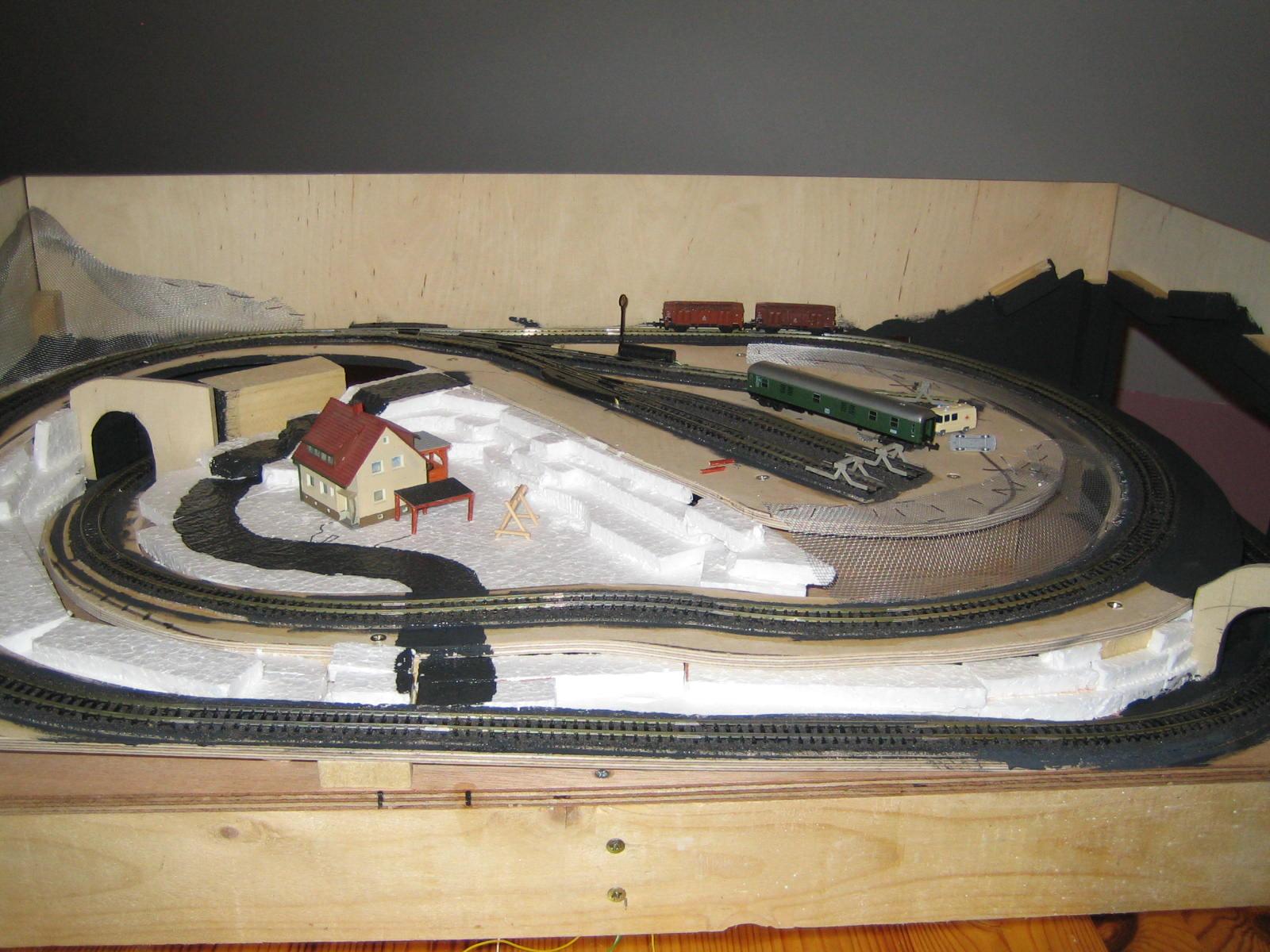 inspiriert von HGH und Hoschi habe ich vor einiger Zeit an meiner kleinen Testanlage zu bauen begonnen. Eigentlich sollte es gleich ne große Anlage werden, aber dazu fehlten dann doch noch einige Ideen bzgl. des Gleisplans. Die Testanlage war eigentlich zum Verbrauch der vorhandenen aussortierten Gleise gedacht. Erste Testläufe führten dann allerdings doch zu einem Austausch des "Mülls".