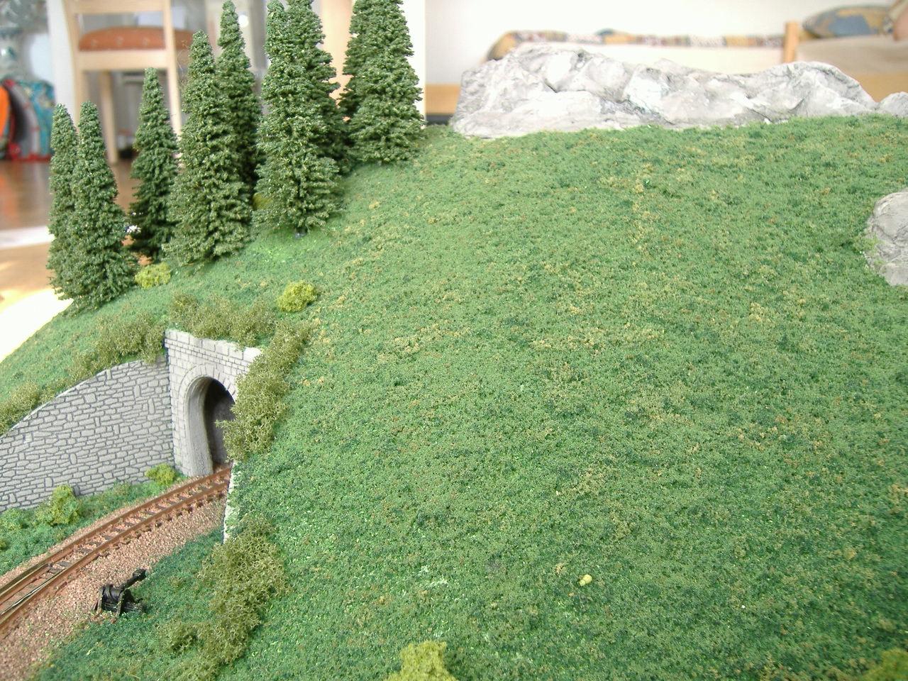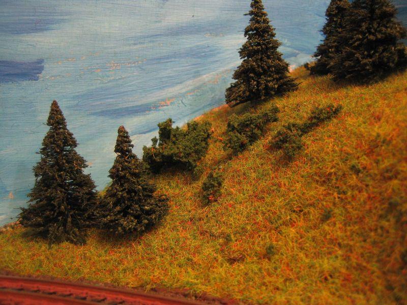 @cristoph,für den Bewuchs habe ich verschiedene feine Flocken von Woodland Scenics / Noch genommen.Habe kein Streugras verwendet,da ich noch Flocken hatte von meiner US HO Anlage.