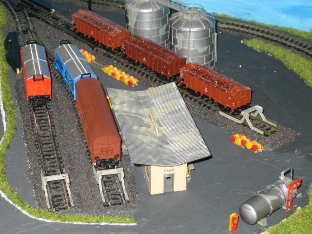 Die Tankstelle habe ich mal vor Jahren für schmales Geld auf einer MoBa-Börse gekauft. Müsste von Vollmer oder Faller sein. Müsste da mal meine alten Kataloge rauskramen. Waren zwei Bausätze. Einmal das Gebäude sowie der Kleinkram und einmal die beiden großen Tanks hinten im Bild. War alles auf grauen Platten. Die habe ich mühsam entfernt, entsorgt und die Teile einzelnd auf der Anlage verteilt. Entstand aus Platznot. Finde es persönlich so aber auch viel besser.