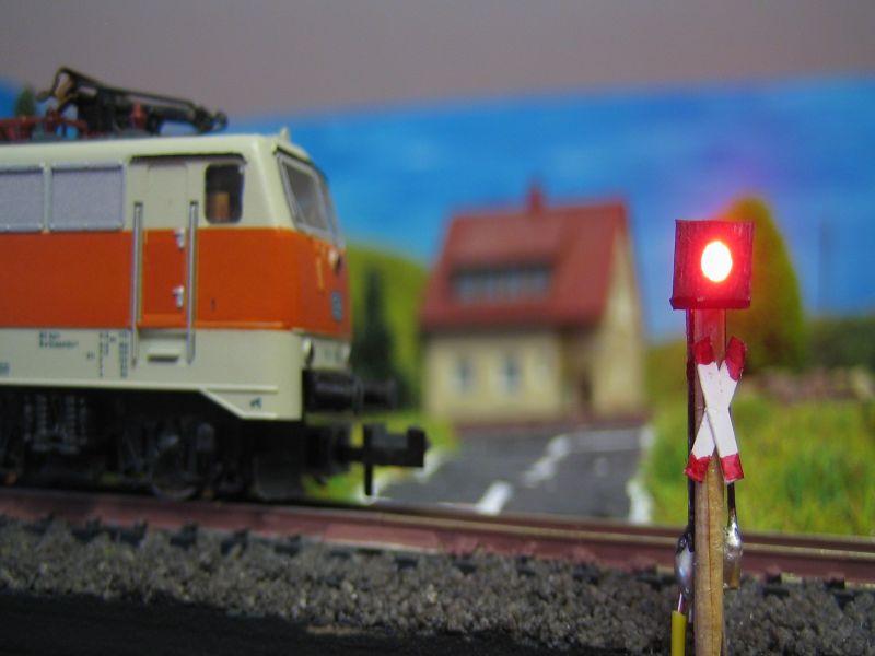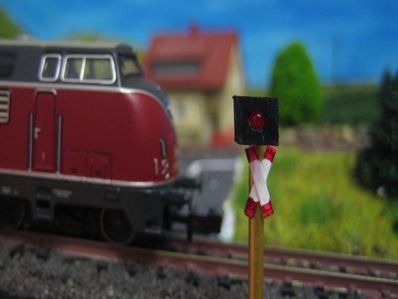 Zu hause das "alte" Andreaskreuz demontiert. Gemäß HGHs Anleitung versucht, die rote Markierung mittels Lineal noch etwas sauberer hinzubekommen. Hat sogar teilweise funktioniert. Die Lötfahnen gekürzt. Ein dünnes Telefonkabel durch das Messingrohr geschoben. Oben angelötet. Die andere Lötfahne ins Messingrohr geschoben. Stromfluss über das Rohr! Unten ein Kabel an das Rohr angelötet. Ging nicht besonders gut. Ist etwas zu beachten, wenn man auf Messing lötet? Meine, da mal was gelesen zu haben. Hier das Ergebnis: (Achtung: Die Bahnarbeiten am Bahnübergang konnten wg. schlechter Witterung noch nicht wieder aufgenommen werden!)
