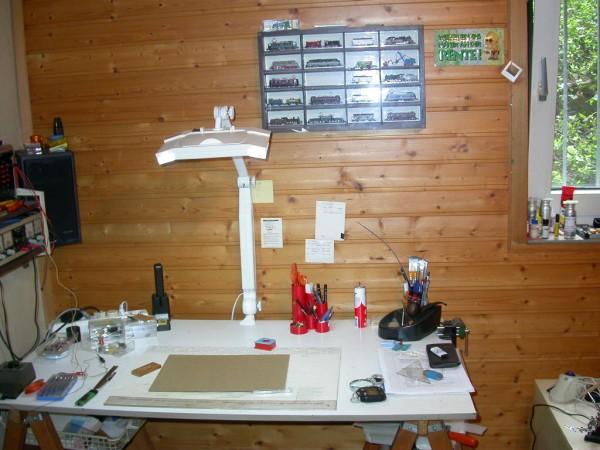c: der Bastel-/Arbeitsplatz mit Lupenleuchte (12-fache Vergrößerung). Das Sehvermögen läßt leider immer mehr nach (so aufgeräumt sieht's nicht immer aus).