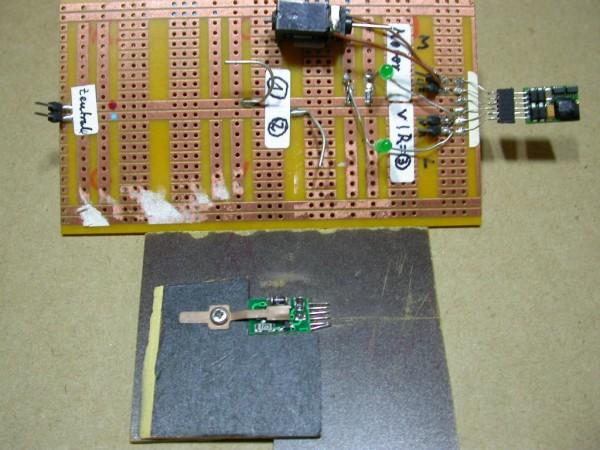 ein Stück Streifenrasterplatine, zwei LED's mit Vorwiderstand, ein alter 12V Motor, ein zweipoliger Anschlußstecker und ein sechspoliger Stecker RM 1,25mm -- fertig.