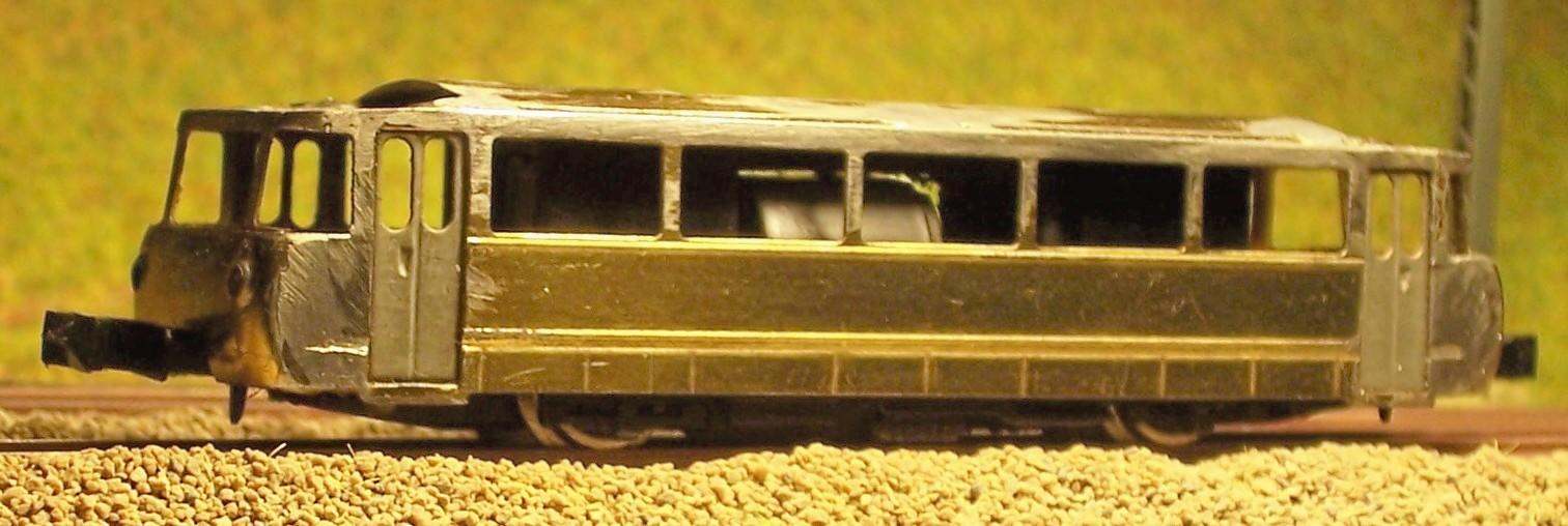 Bei diesem Gehäuse fehlt noch das Dach. Es passt auf das Fahrgestell des Arnold-Schienenbusses.