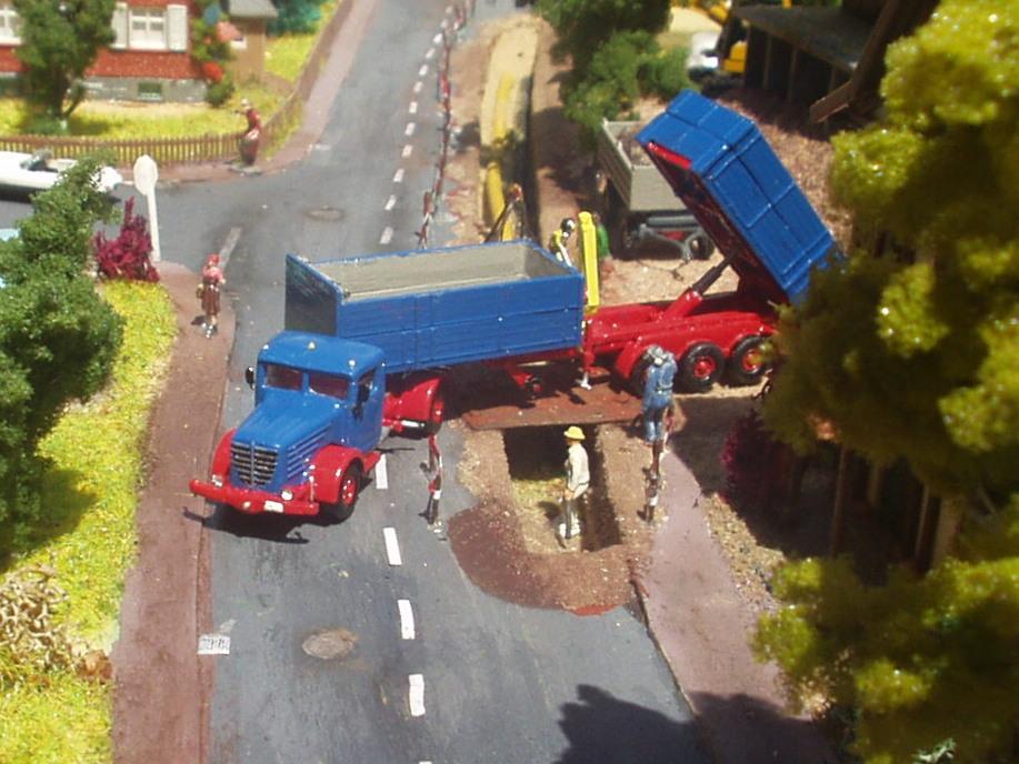 Den gibt es bei mir auf der Anlage, als Eigenbau Sattelkipper mit Kippfunktion und sich bewegender Hinterklappwand..