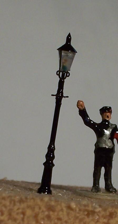 Die Figur daneben soll verdeutlichen, dass dieser "Herr" die Lampe so wie es beim Vorbild geschah, diese mit Hilfe einer Stange zünden konnte.