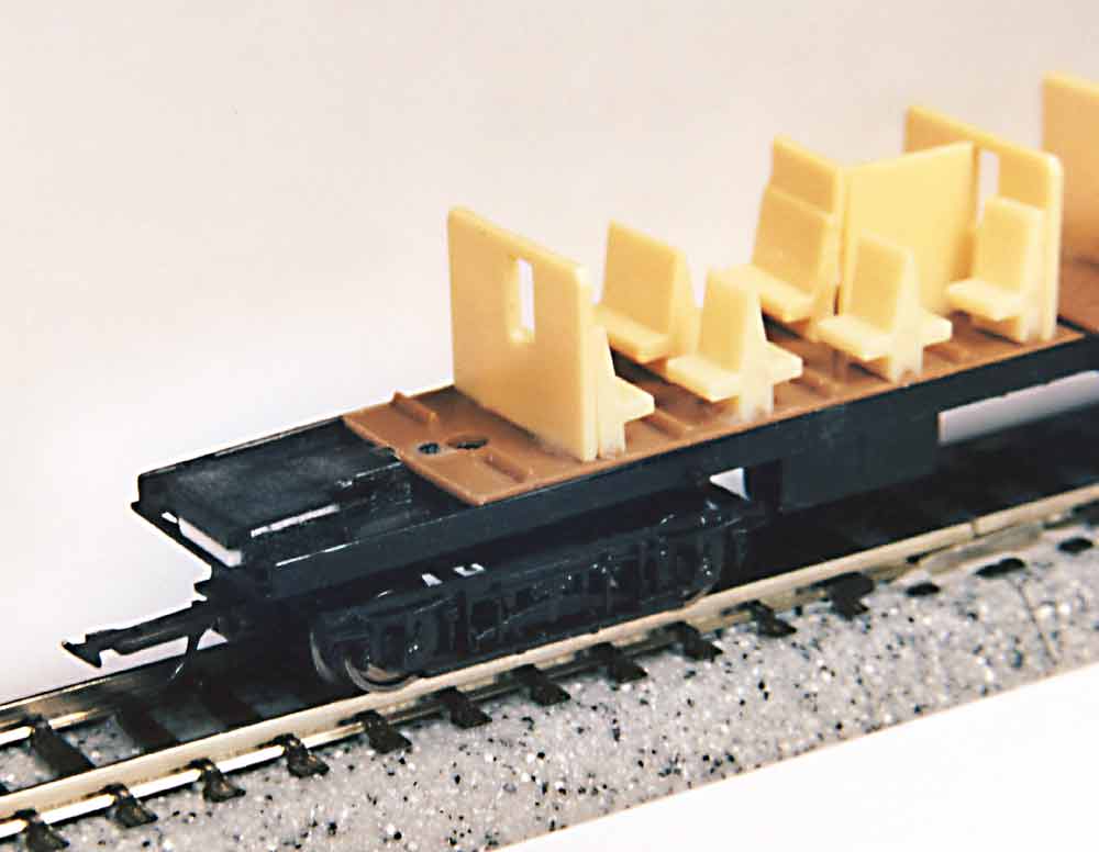 Das nächste Problem ist, die Wagen sind einfach zu hoch. Die Ursache ist folgende, die Fleischmann-Drehgestelle werden mit einer Bundbuchse versehen, durch die dann die Schraube geführt wird, die sie mit dem Untergestell verbindet. Es entsteht ein großer Spalt zwischen Drehgestell und Untergestell. Wenn man die Buchse wegläßt, dann befinden sich die Drehgestelle zwischen den Längsträgern der Seitenwände und können nicht mehr ausschwenken. Ich habe das folgendermaßen gelöst. Die Seitenwangen der Drehgestelle haben oben einen kleinen Steg, den habe ich auf die Auflagefläche runter geschliffen. Den Bund der Buchse habe ich von rund 1,5mm auf 0,3mm runtergeschliffen. Die Seitenwände habe ich im Schwenkbereich der Drehgestelle innen angefast. Die Drehgestelle werden dann so angeschraubt, daß die Drehgestelle ein Höhenspiel von ca 1mm oder mehr haben. Dadurch paßt die Höhe der Wagen genau zum Pwi-28 von Fleischmann, der bei mir mit den Altenbergern laufen soll, so war es auch beim Vorbild. Zwischen Drehgestellen und Längsträgern ist dann ein Spalt im 10'el mm-Bereich und sie laufen sogar im 223mm Radius. Falls es Höhenwechsel im Gleisverlauf gibt, können die Gehäuse auf die Drehgestelle auflaufen. Diesen Trick habe ich schon mal erfolgreich beim Tieferlegen und Drehgestellwechsel bei den 4-achsigen Kühlwagen von Piko gemacht. Dort sind allerdings die Kupplungen im Drehgestell, wie sich die Altenberger im Zugverband verhalten, kann ich erst nach Fertigstellung der anderen Wagen und der Lösung der Kupplungsfrage überprüfen.