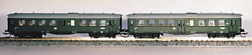 obwohl ich als Epoche III Bahner noch genügend Roco-Eilzugwagen der Epoche IV herumliegen habe, hatte ich diesen Umbau mit den Roco-Drehgestellen gescheut. Habe dafür die Wagen durch Herunterschleifen an den Drehgestellaufnahmen, kleinere Radsätze und Tausch der KK-Deichseln tiefer gelegt. Passt dann optisch gut zu vielen anderen Bauarten, ändert aber nichts daran, daß die Drehgestelle eigentlich weiterhin zu hoch sind.