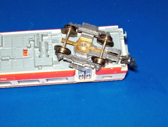 Bei Trix muß der Wagenkasten vom Untergestell abgenommen werden, dann werden die Sicherungsringe freigelegt, die die Drehgestelle halten. Ich würde davon aber abraten, da dann auch die Federdtähte für die Kulissenführungfreigelegt werden und herausfallen können. Für die Montage der Innenbeleuchtung ist das auch nicht nötig, diese kannan die Metallzapfen angelötet werden.
