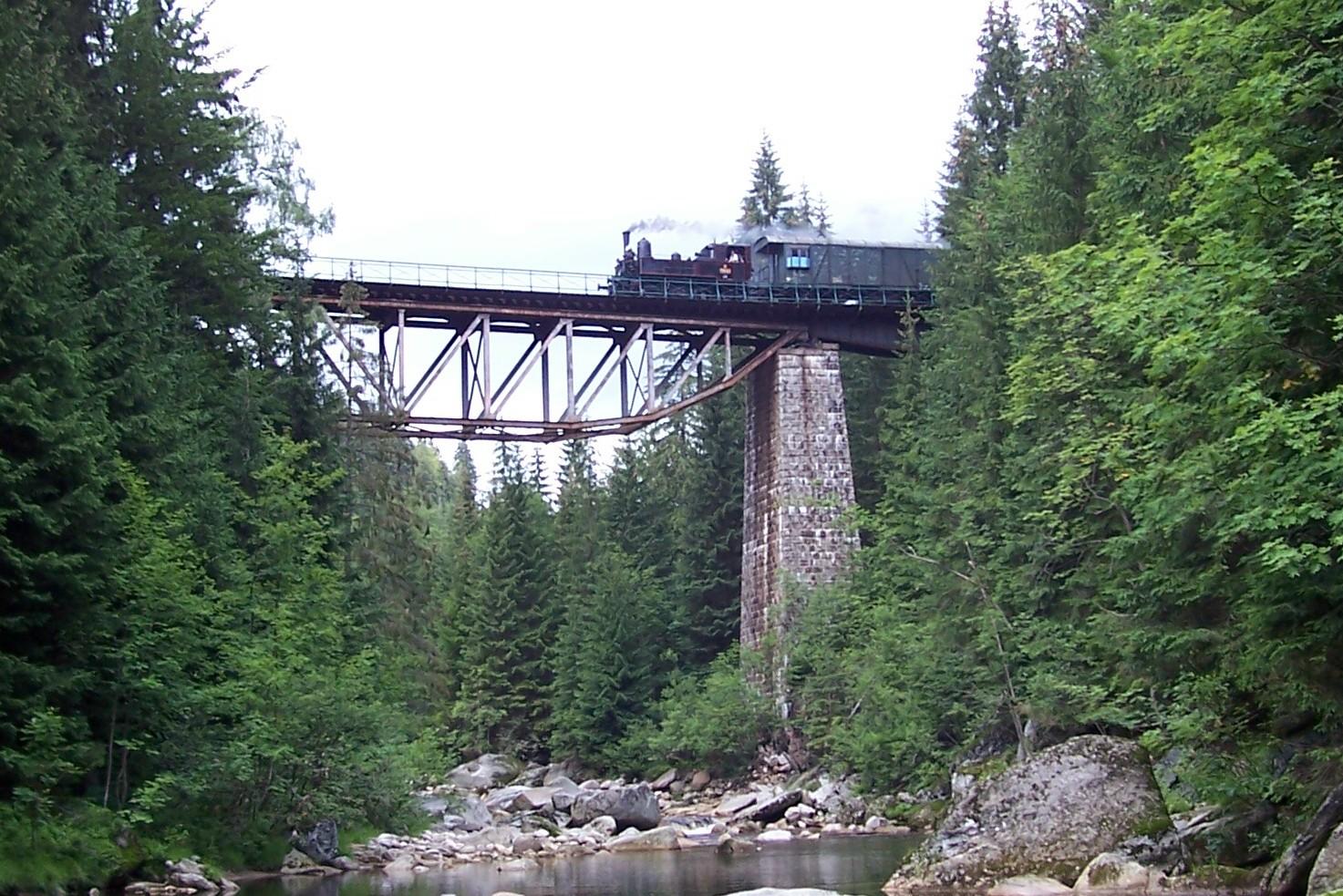Auf dem Bild ist eine 310 der CD auf der Iserbrücke in Richtung Korenov (Polaun) fahrend zu sehen. Bis 1945 war unter der Brücke in Flussmitte die Deutsch/Tschechische Grenze.