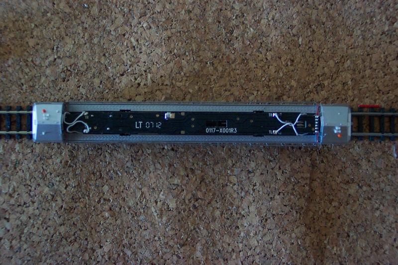 Beim mittleren Teil des Gehäuses ist das noch relativ einfach: Man drückt die Klemmen unter dem Wagenboden zusammen, und schon kann man das Gehäuse abnehmen. Die Schrauben zur Demontage der Platine liegen jedoch unter den Führerhäusern. Und die sind mit ausgerechnet mit den Scheiben der Scheinwerfer am Chassis befestigt. Da das nirgends geschrieben steht, schiebt und zieht man solange an dem Gehäuse herum, bis die kleinen Scheibchen in hohem Bogen herausspringen. Jetzt läßt sich zwar das Gehäuse abziehen, aber nun darf man mit Lampe und Lupe die Scheiben suchen. (Ich habe sie immerhin wiedergefunden.) Das Wiedereinsetzen der Scheiben nach dem Zusammenbau ist fummelig.