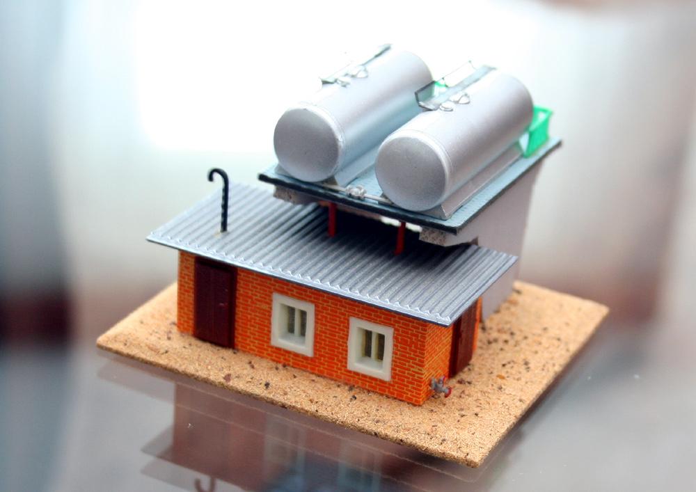 verrichten Unten übrigens die versprochenen Nahaufnahmen. Wo ist denn der Feuerlöscher? Sowas brauchts ja an einer Tankstelle unbedingt! Na ja, diesen nachzubilden traue ich mir nicht zu, deshalb habe ich beschlossen, dass er in einer  der kleinen Hütten hängt!  Bei den Nahaufnahmen sieht mal natürlich sofort, dass es sich hier um ein Modell handelt, aber damit müssen wir leben.