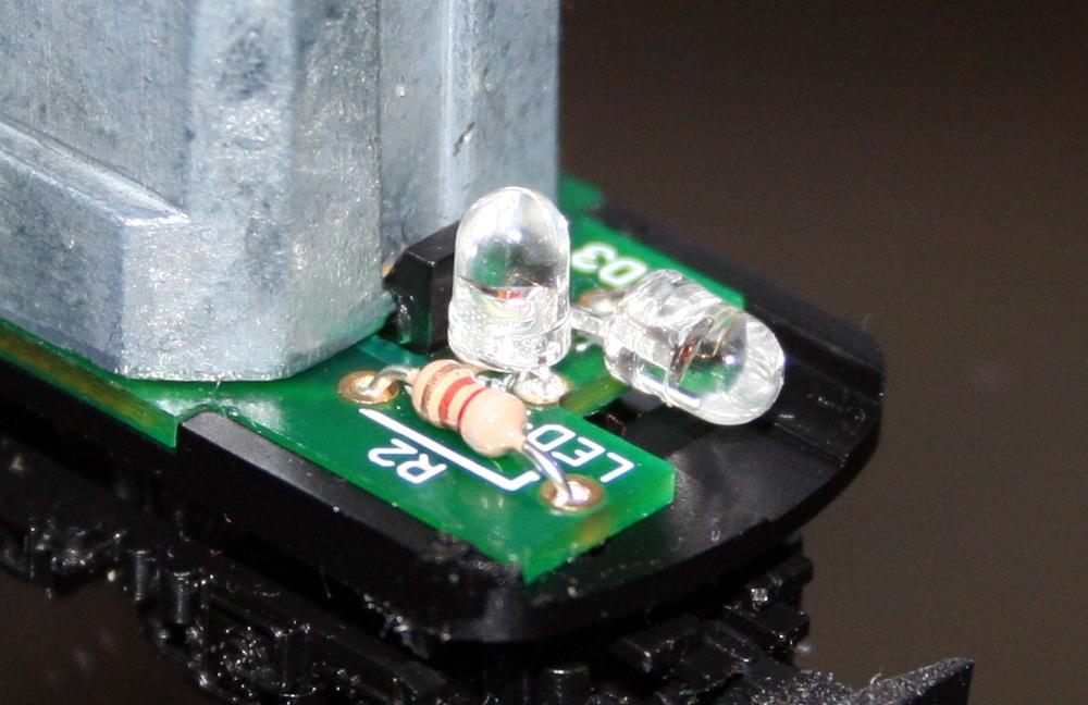 "Die stehende LED ist zusätzlich zur Ausleuchtung des oberen Spitzensignales notwendig. Also es gibt 4 LED s in der Lok ,aber alle weiß."