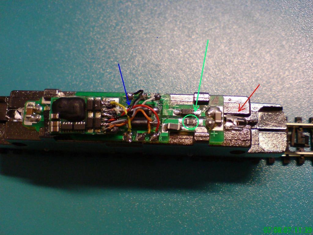 Habe diesen Baustein (türkiser Pfeil) noch mal nachgelötet, nach dem ich alle Bauteile in Richtung zu der Diode mal abgetastet hatte.