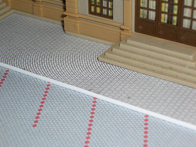 Ich habe meine Fußwege aus 1 mm Polysterolplatten hergestellt und den jeweiligen Belag eingeritzt und dann farblich nachbehandelt. Sehr schnell lassen sich so Fußwegen mit den zuerst genannten Granitplatten herstellen, aufwendiger sind Fußwege mit Betonplatten 30cm x 30 cm.